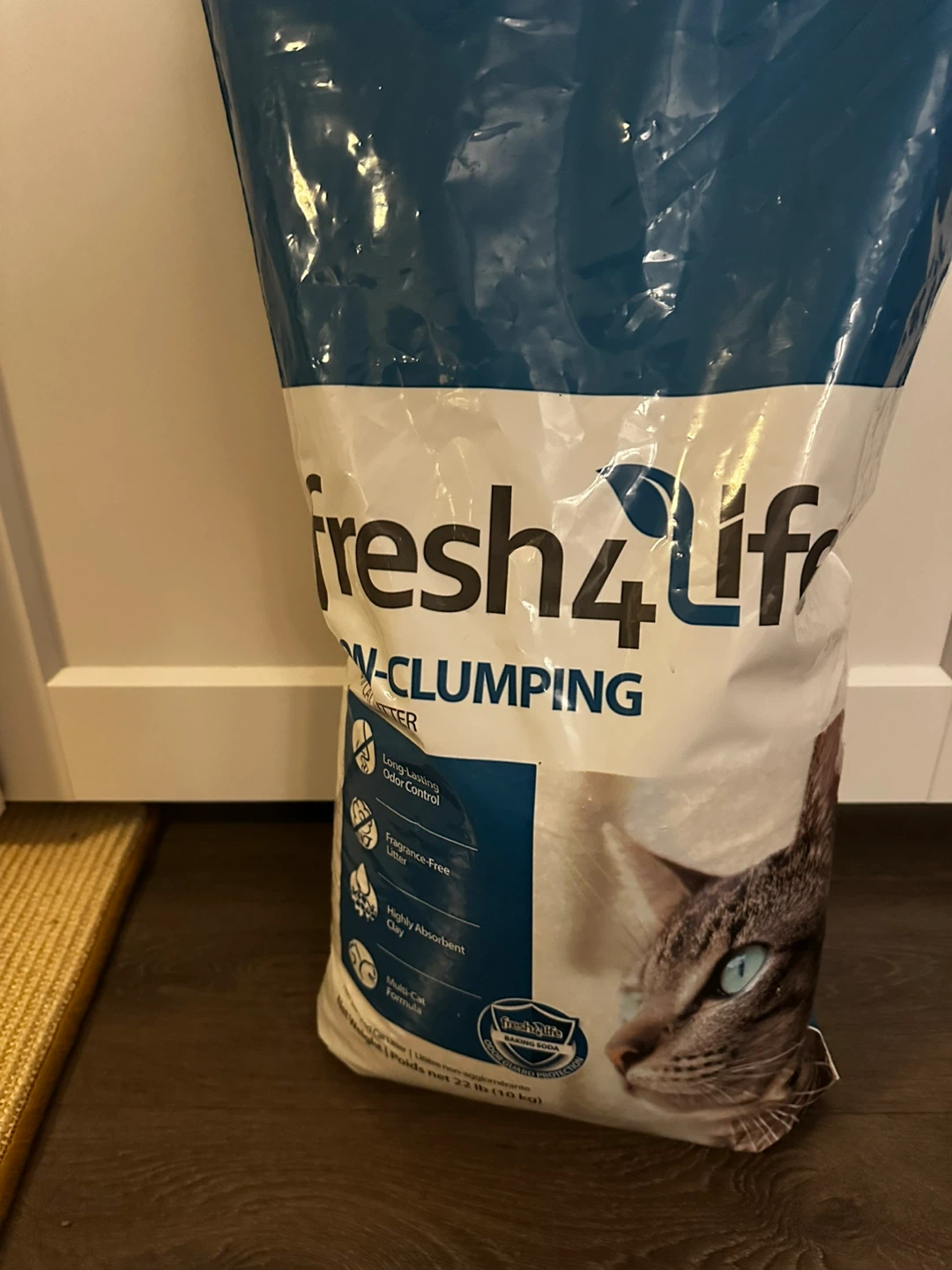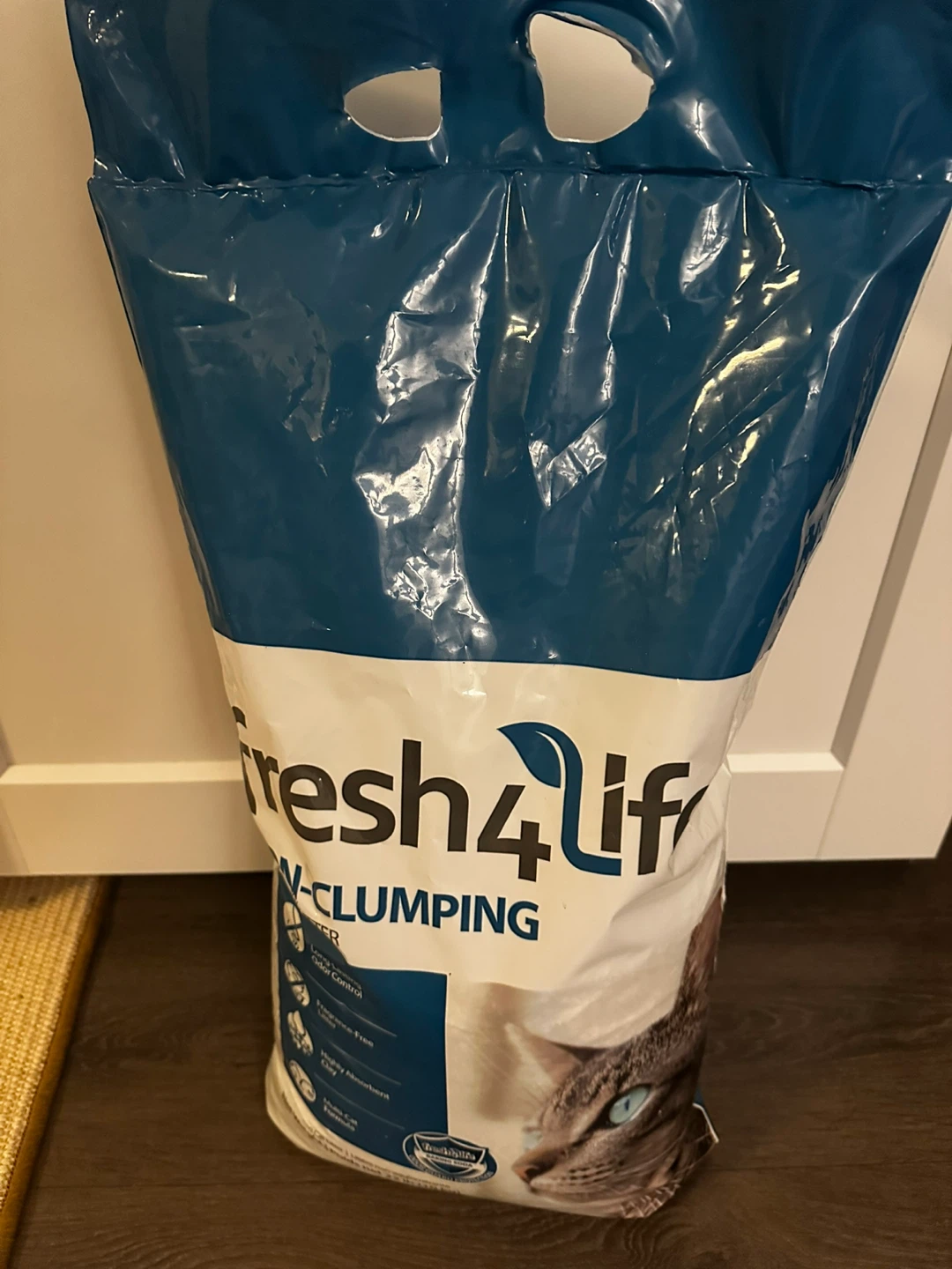 Selling a bag of Fresh4Life low-clumping cat litter. It's designed for long-lasting odour control and is fragrance-free. This litter is also highly absorbent and suitable for multi-cat households