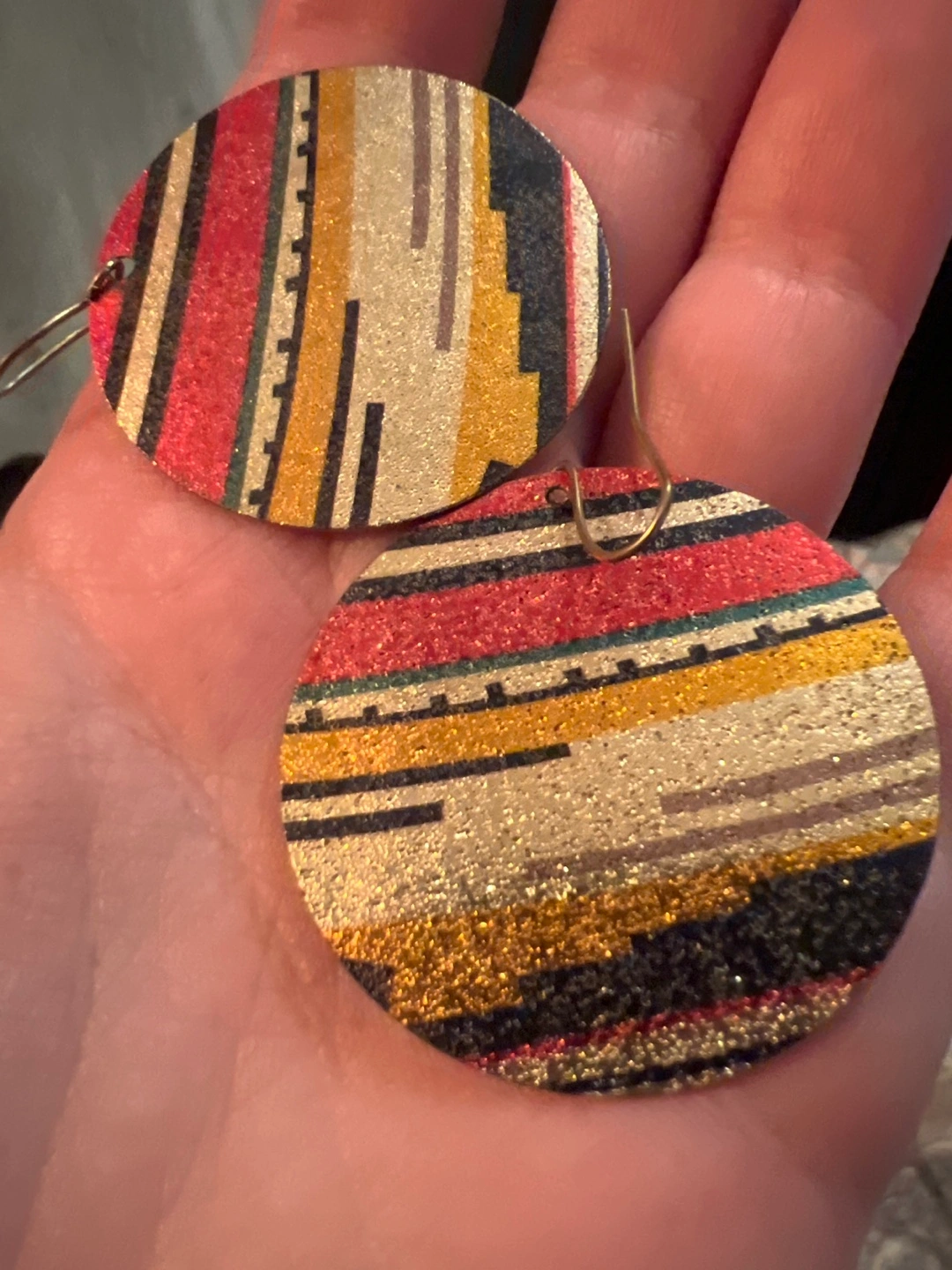 Selling a pair of round earrings with a fun striped pattern! The earrings have a mix of colours, including red, gold, and black. They're in great condition and ready for a new home