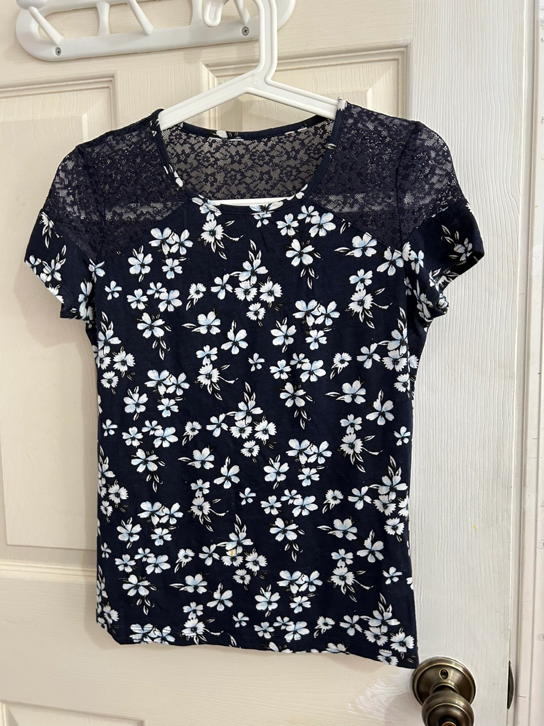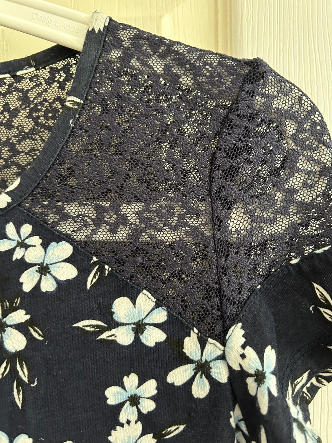 Here's a cute Design Anna top! It features a floral pattern with lace detailing on the shoulders and neckline. Perfect for adding a touch of elegance to your wardrobe