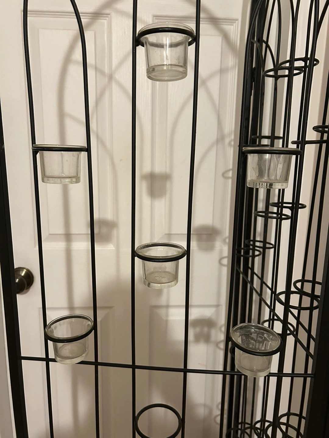 Selling a black metal folding screen room divider. It features a unique design with spaces for small glass cups or vases, adding a touch of elegance to any room. Perfect for creating separate spaces or as a decorative accent