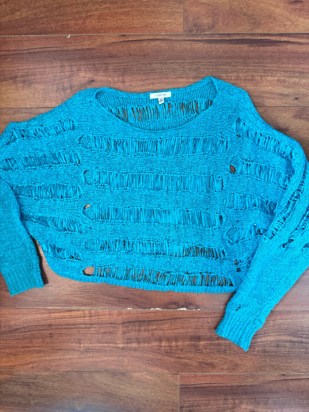 Selling a cute I Love H81 knit sweater! It's a stylish blue colour and features a distressed design. Size small