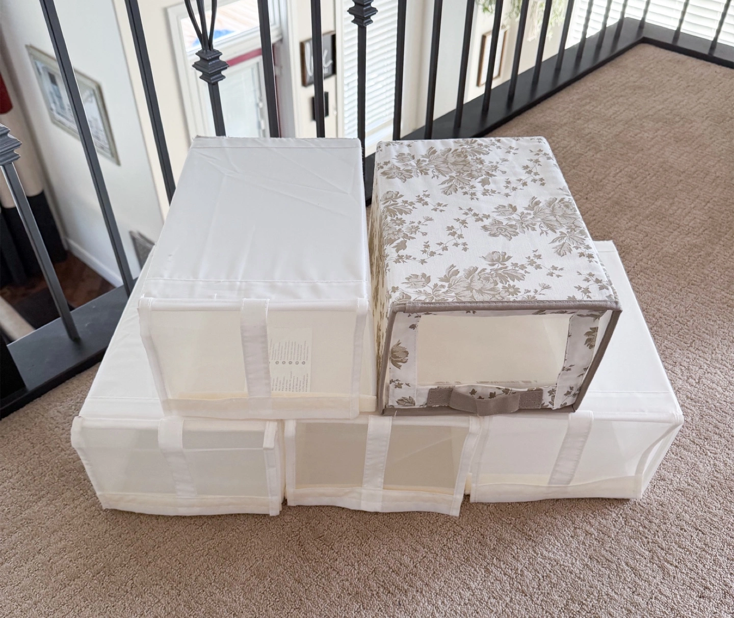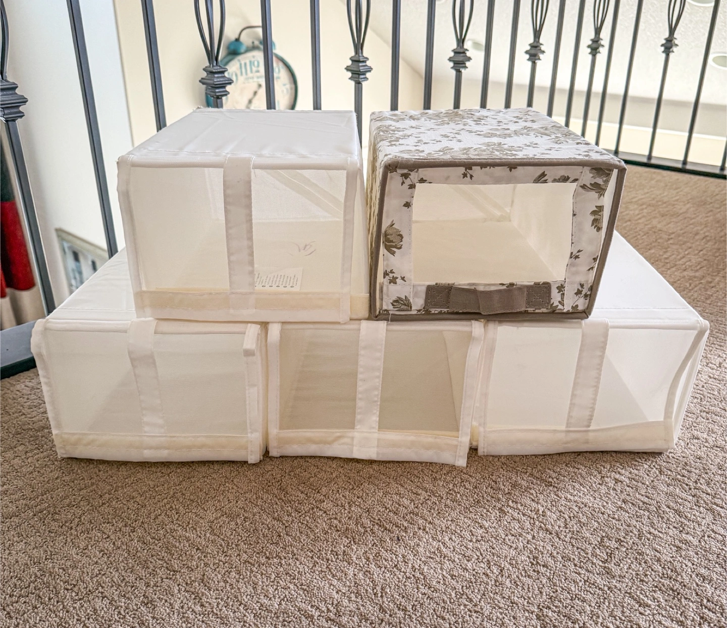 Selling a set of 5 storage cubes. They are in great condition and perfect for organizing your space. The set includes a mix of plain and floral patterned cubes, as shown in the photos. Great for closets, shelves, or under-bed storage!