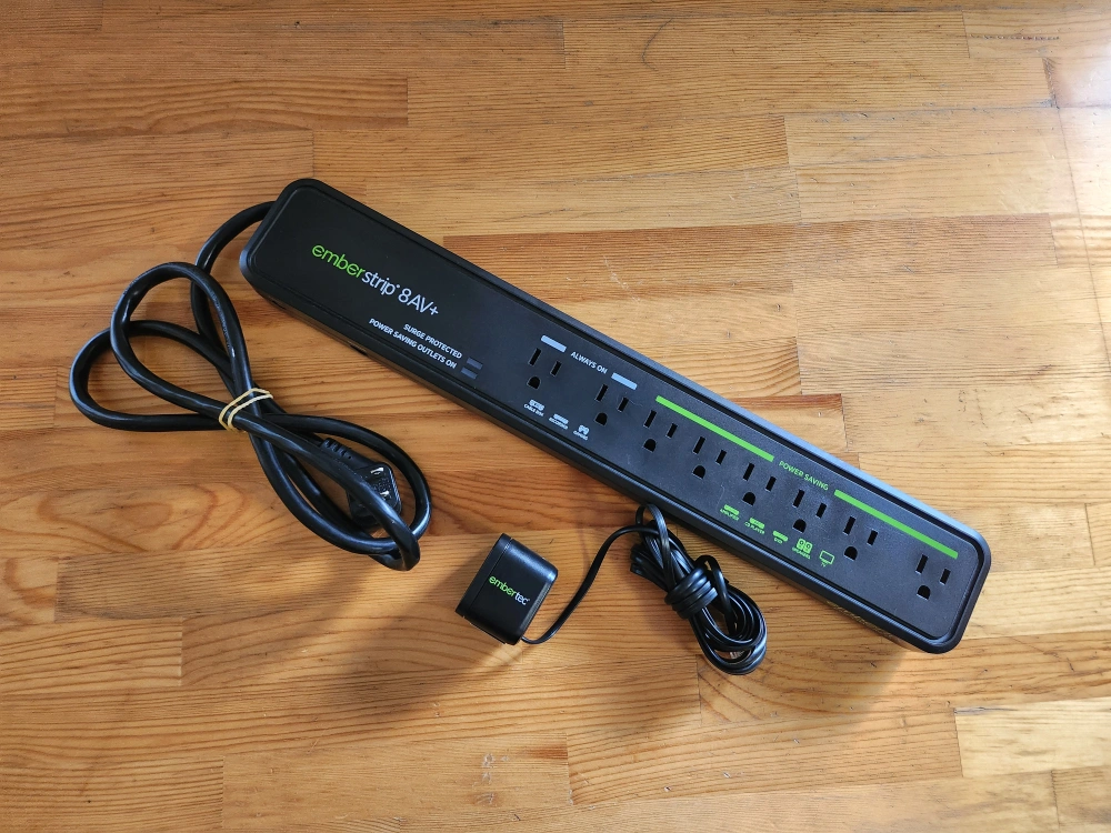 Embertec Emberstrip 8AV+ power bar. It's in great condition and ready to help you save energy! It features surge protection and power-saving outlets. The Embertec power bar helps reduce standby power consumption, saving you money on your electricity bill. Includes the power bar and a small control unit.