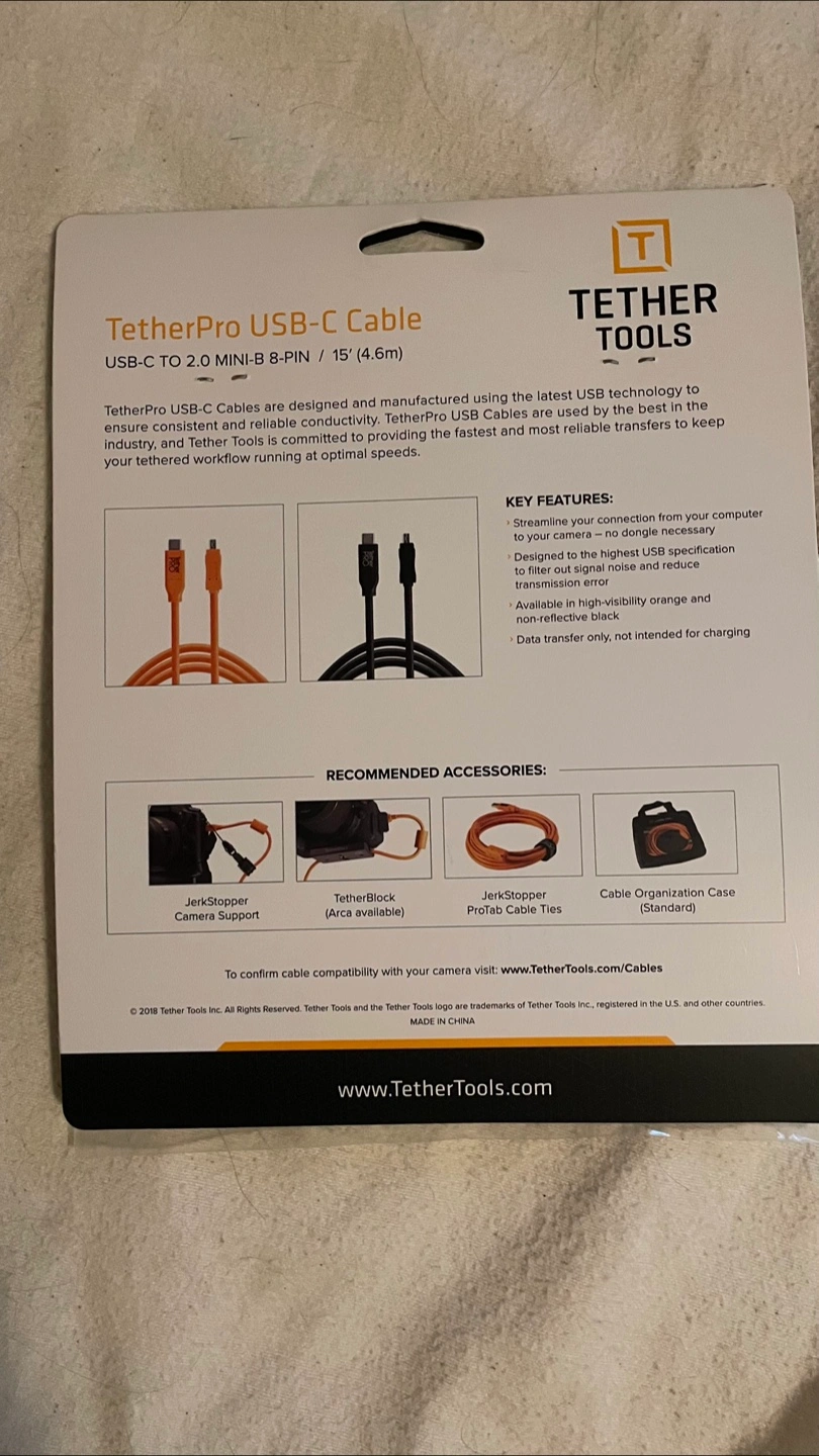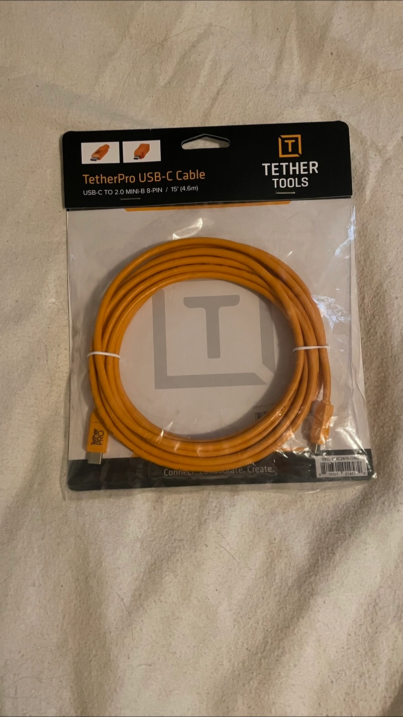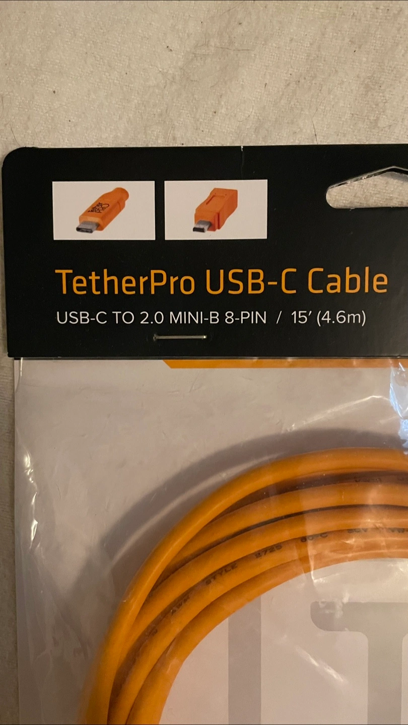 This is a brand new Tether Tools TetherPro USB-C cable. It's a USB-C to 2.0 Mini-B 8-Pin cable, 15' (4.6m) long. It's designed to streamline your connection from your computer to your camera, and is designed to the highest USB specification to filter noise and reduce transmission error. The cable is a high-visibility orange colour. Selling because I bought the wrong cable for my camera and missed the return date :( New in package never opened.