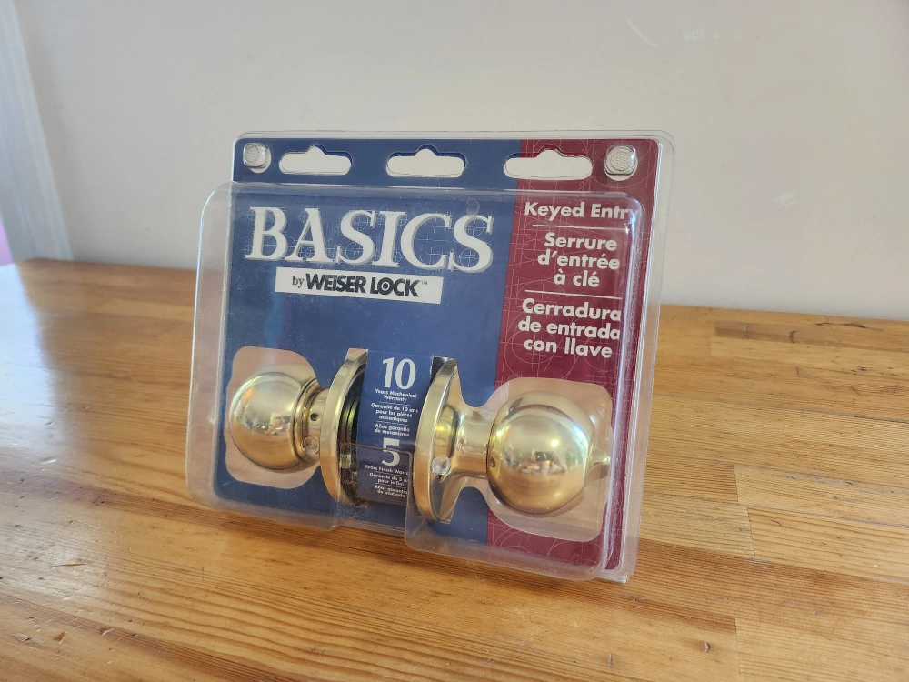 Brand new Weiser Lock Basics keyed entry door knob. This is still in its original packaging and ready to install. It includes the necessary keys and hardware for installation