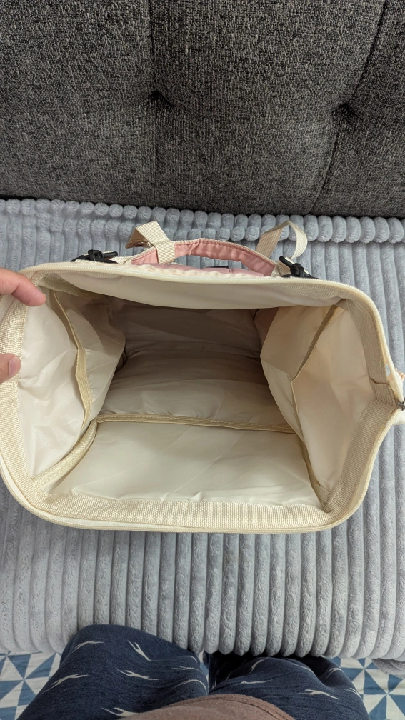 Check out this adorable diaper backpack! It's got a lovely pink and cream colour scheme. The front reads "YOU ARE MY SUNSHINE young fashion backpack" and features an embroidered maple leaf design. Inside, there are plenty of compartments to keep everything organized for your little one's needs