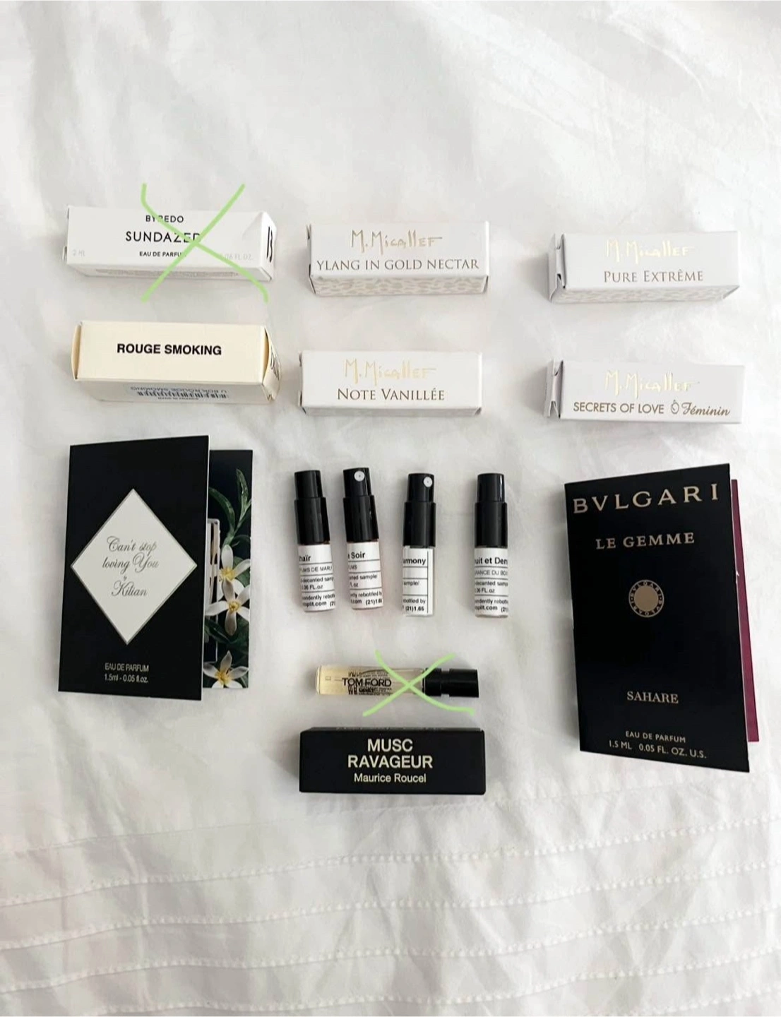 93$10 each, but I will give discount for multiple purchases: Byredo Sundazed (SOLD) M. Micallef Ylang in Gold Nectar M. Micallef Pure Extreme BDK Rouge Smoking (PENDING) M. Micallef Note Vanillée M. Micallef Ô Feminin Kilian Can’t Stop Loving You Parfums de Marly Althaïr BDK Pas Ce Soir Kilian Bamboo Harmony Fragrance du Bois Minuit et Demi Bvlgari Le Gemme Sahare Tom Ford Lost Cherry (SOLD) Frederic Malle Musc Ravageur Please see my other listings or ask me for more (not everything is listed). I also have full bottles for sale. Pick up in Mississauga.