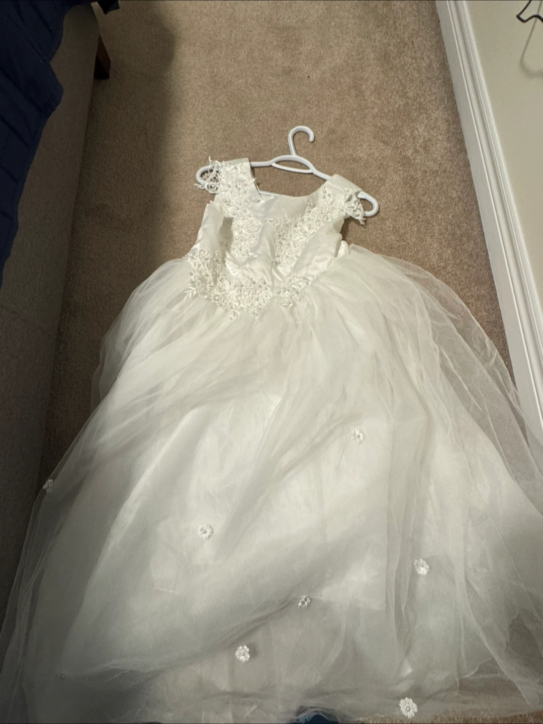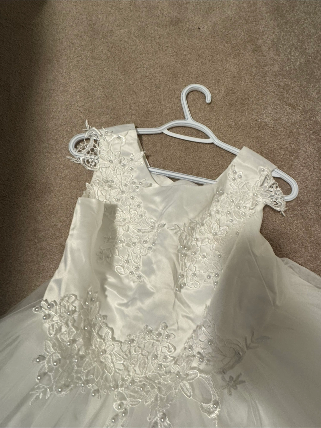 Selling a white dress with lace and pearl detailing. It's in great condition and ready for a new home! Retail price was 550