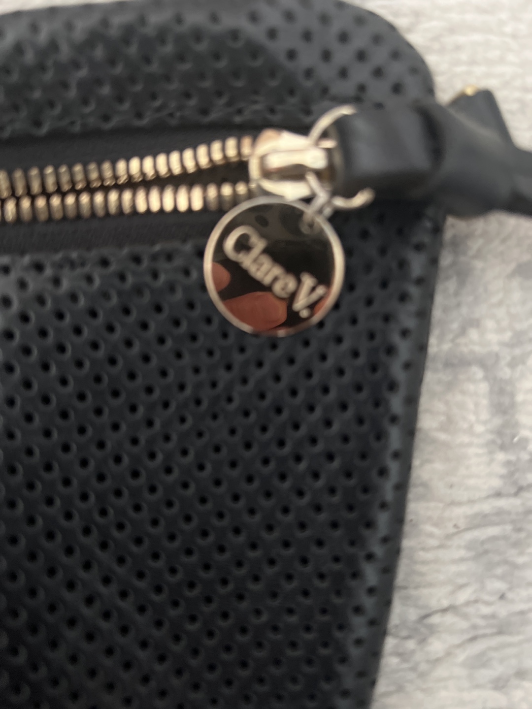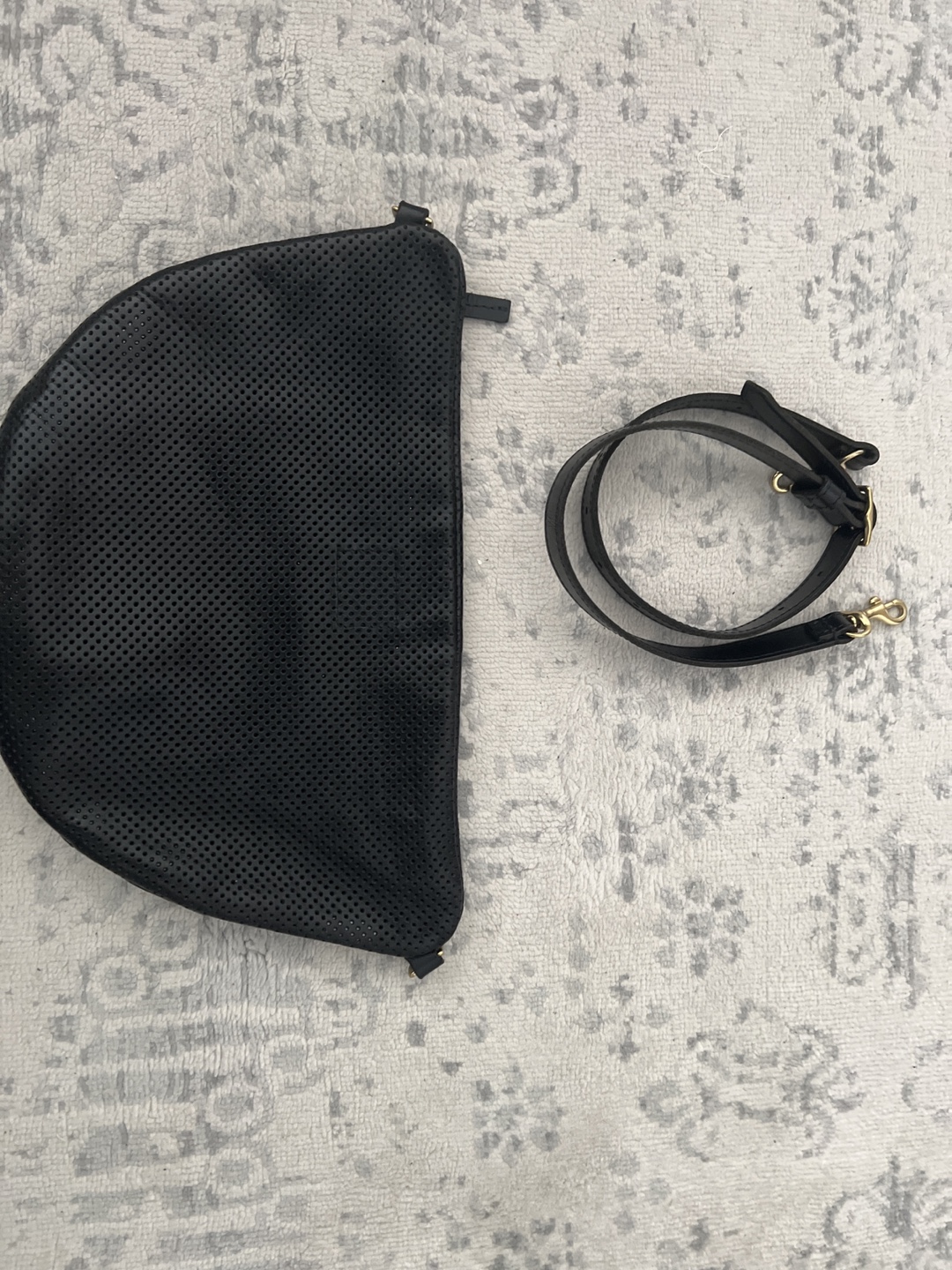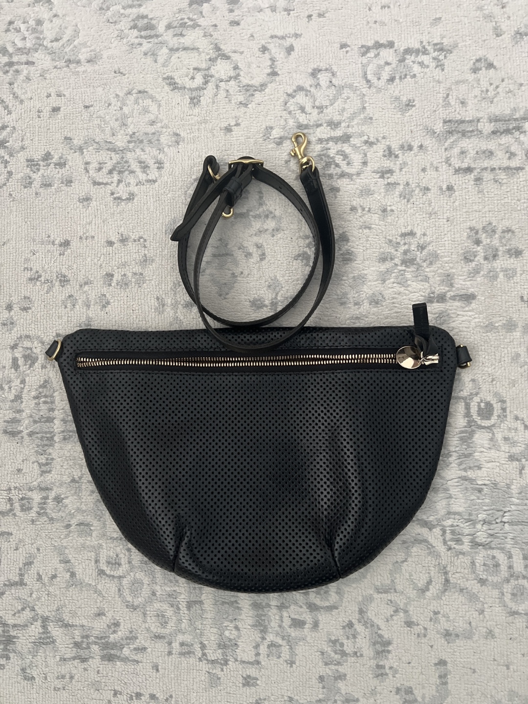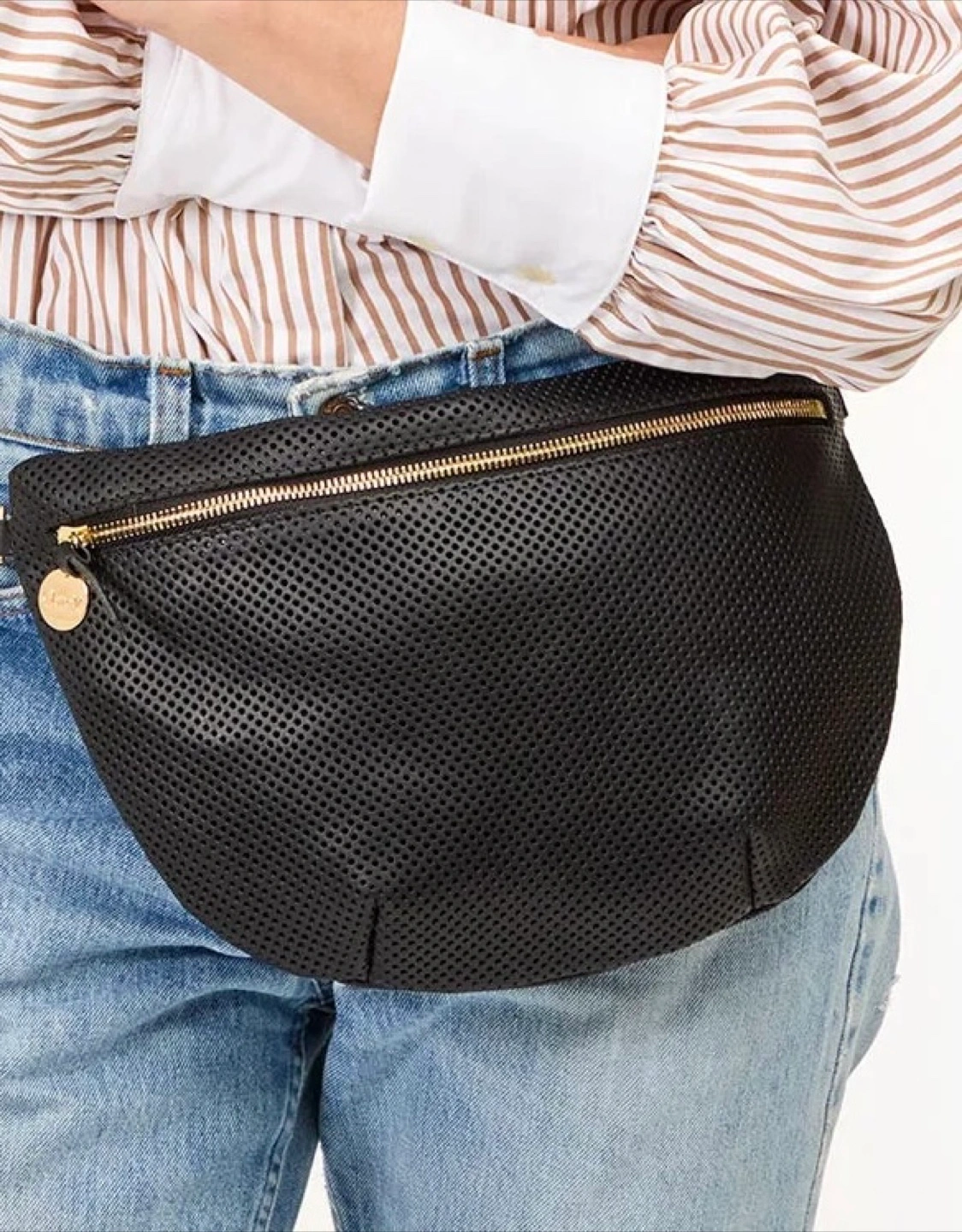 Selling a Clare V Grand Fanny in perforated black. It's made of leather and has a cool, perforated design. Perfect for keeping your essentials close and your hands free!