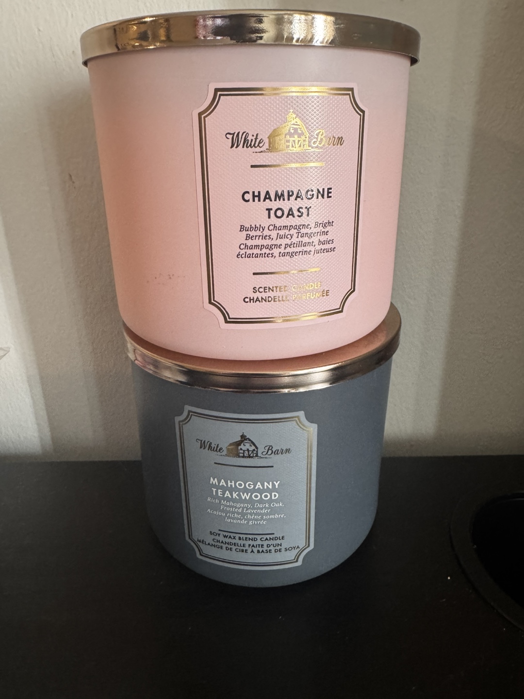 Two lovely White Barn candles for sale! One is Champagne Toast, with a bubbly champagne and bright berries scent. The other is Mahogany Teakwood, featuring rich mahogany and dark oak notes. Both are soy wax blend candles.