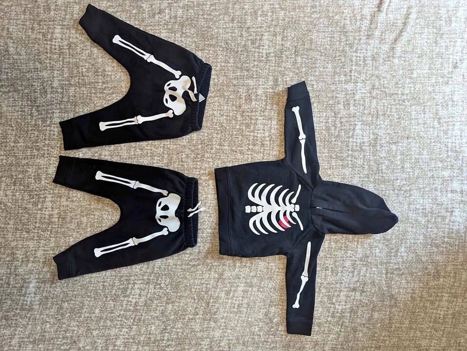 3-piece skeleton costume set with hoodie + 2 pants. Black with white skeleton bones and a little red heart detail. Soft, cozy, and easy to layer underneath for chilly trick-or-treating. Size: 12–18 months Condition: Excellent (like new; packaged for storage) Includes: Hoodie + matching pants Price: $12 (or best offer) Pickup in Burlington