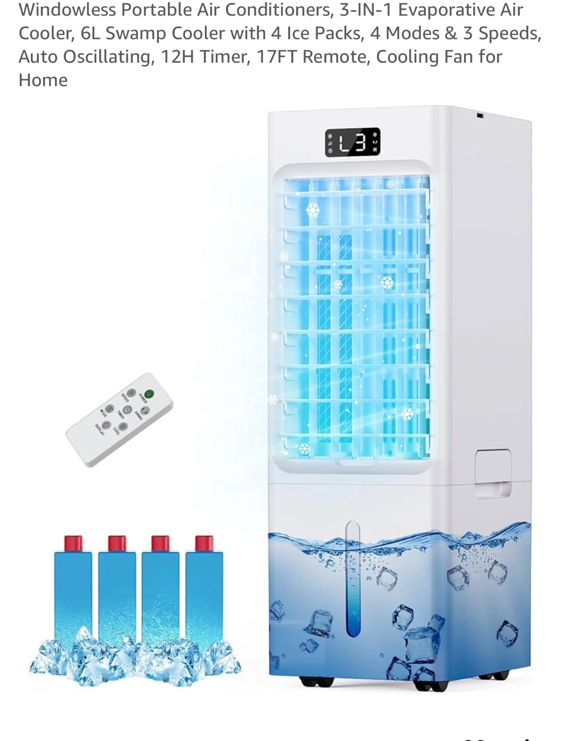 3 Wind Spees & 4 Wind Modes, 3-in-1 Device, 4 Ice Packs, 6L Large Water Tanks, Built-in Handles & Casters3 Wind Spees & 4 Wind Modes, 3-in-1 Device, 4 Ice Packs, 6L Large Water Tanks, Built-in Handles & Casters