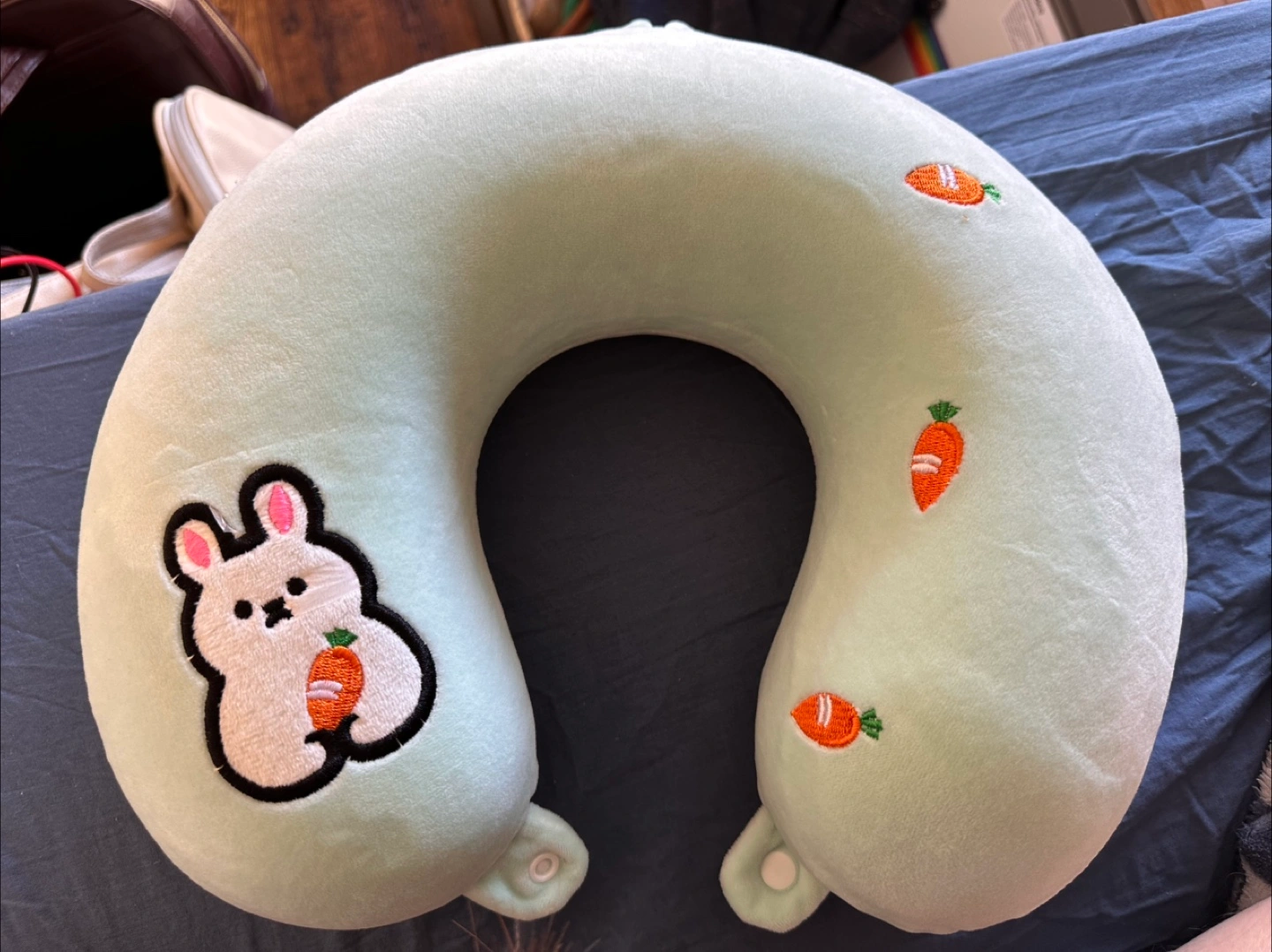 Here's a super cute neck pillow featuring a bunny and carrot design! It's perfect for travel or just relaxing at home. It's in great condition and ready for a new home