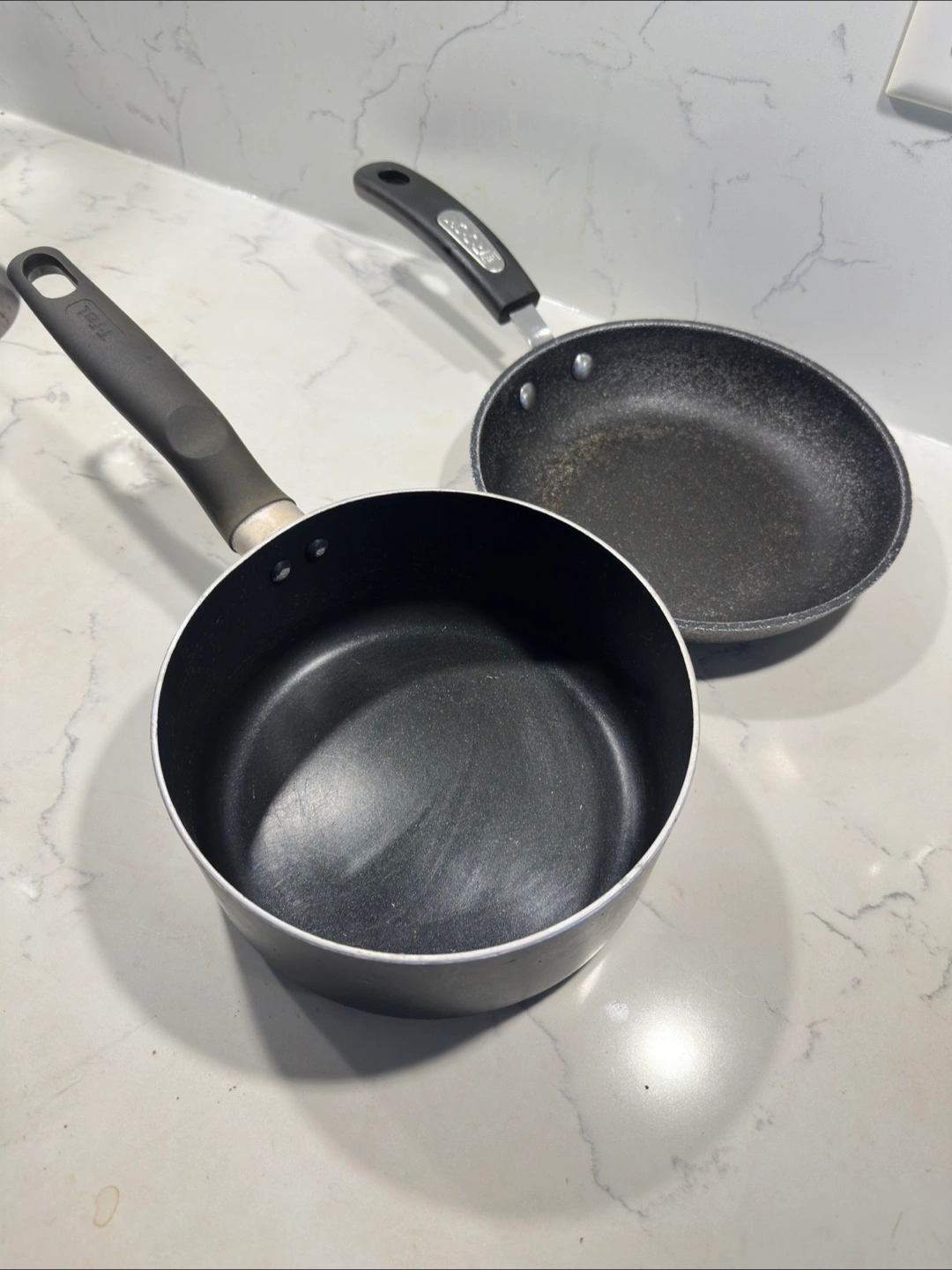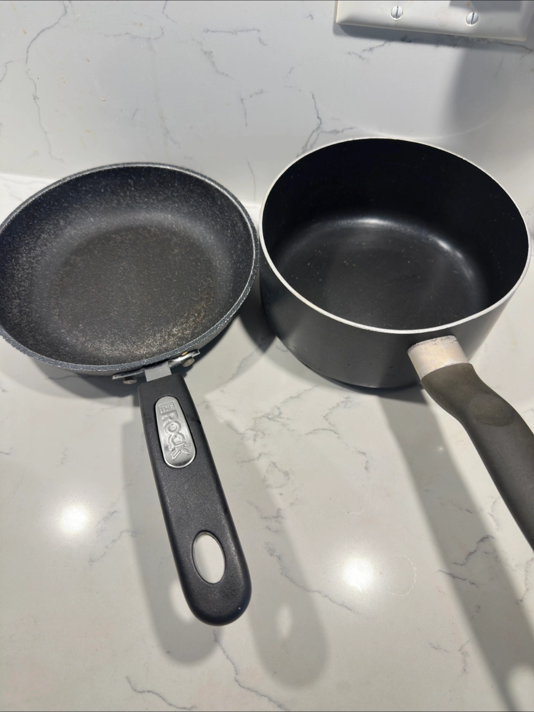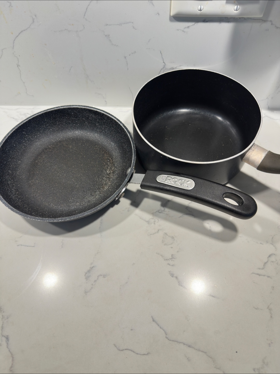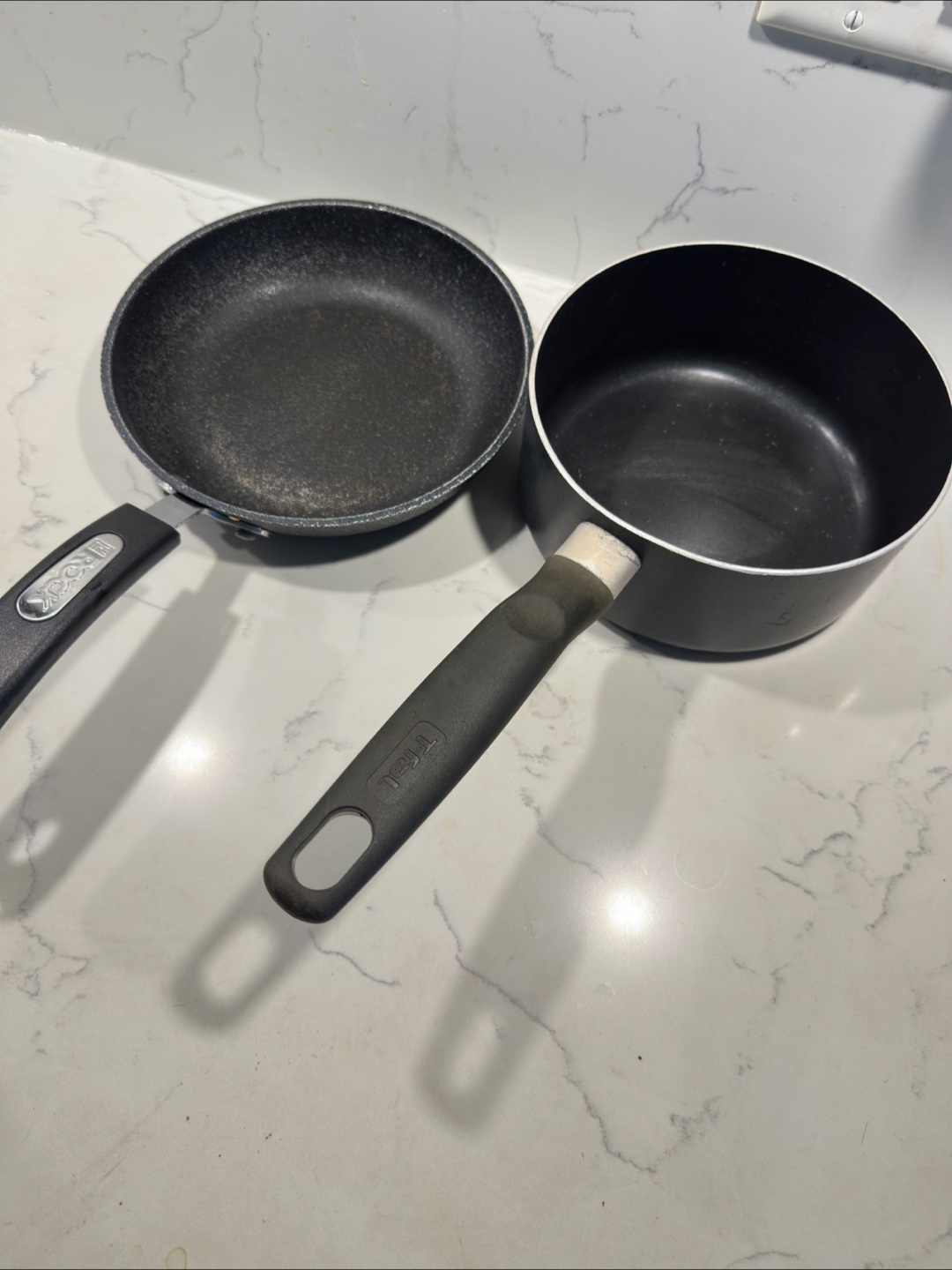 Selling a frying pan from The Rock and a saucepan from T-fal. Both are in used condition, perfect for someone just starting out or needing some extra cookware! Some scratches are there.