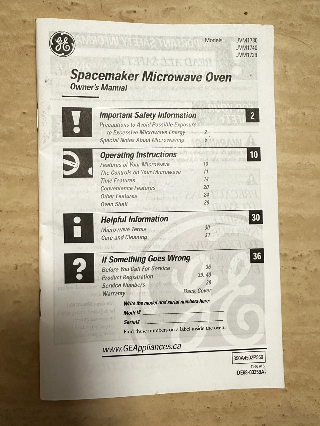 Selling a GE Spacemaker Microwave Oven, model JVM1730. It's in good working condition and ready for a new home. Comes with the owner's manual.