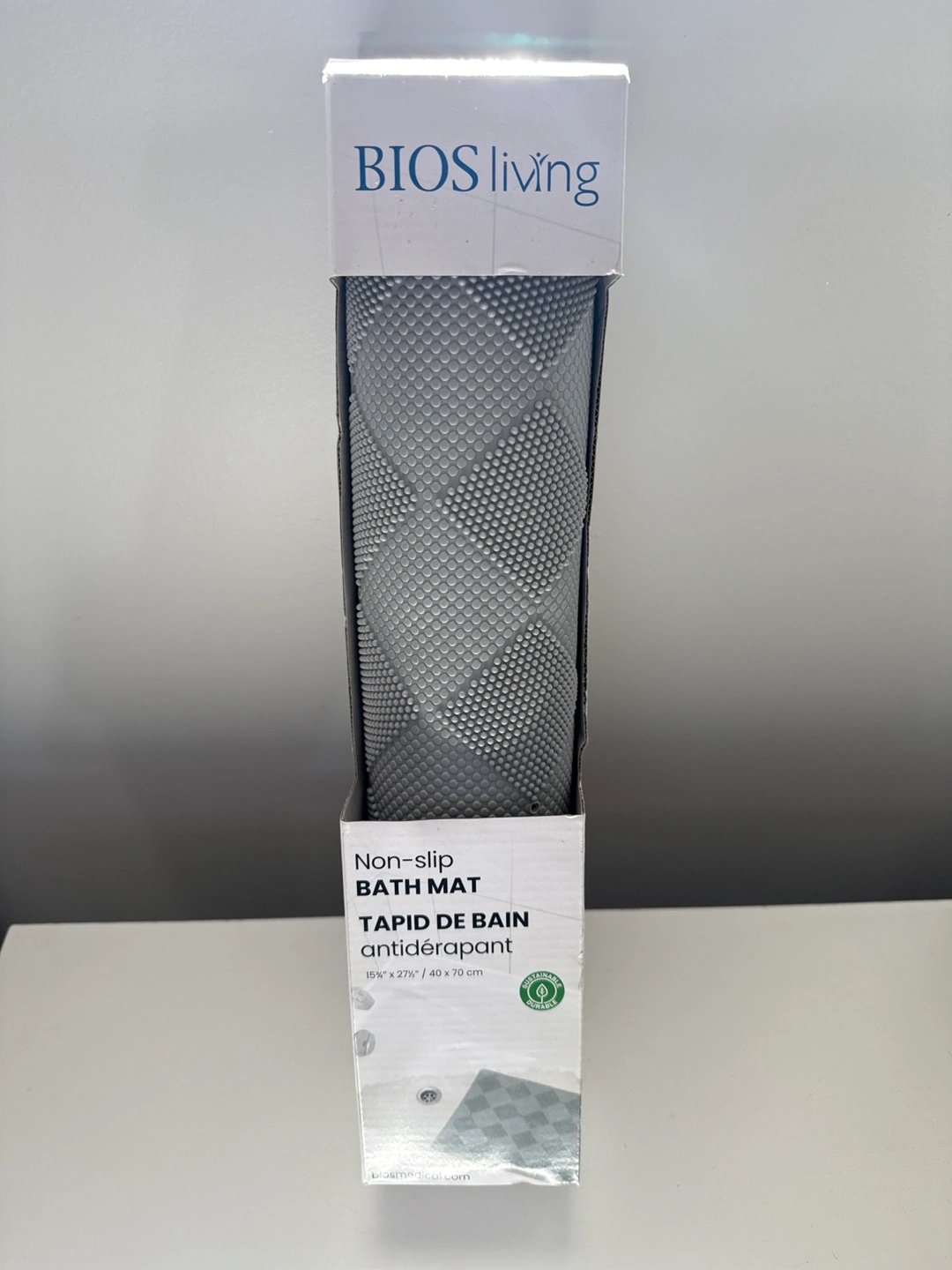 Selling a brand new BIOS living non-slip bath mat! It's still in its original packaging. The size is 15 3/4" x 27 1/2" / 40 x 70 cm. Keep your bathroom safe and stylish with this durable and sustainable bath mat