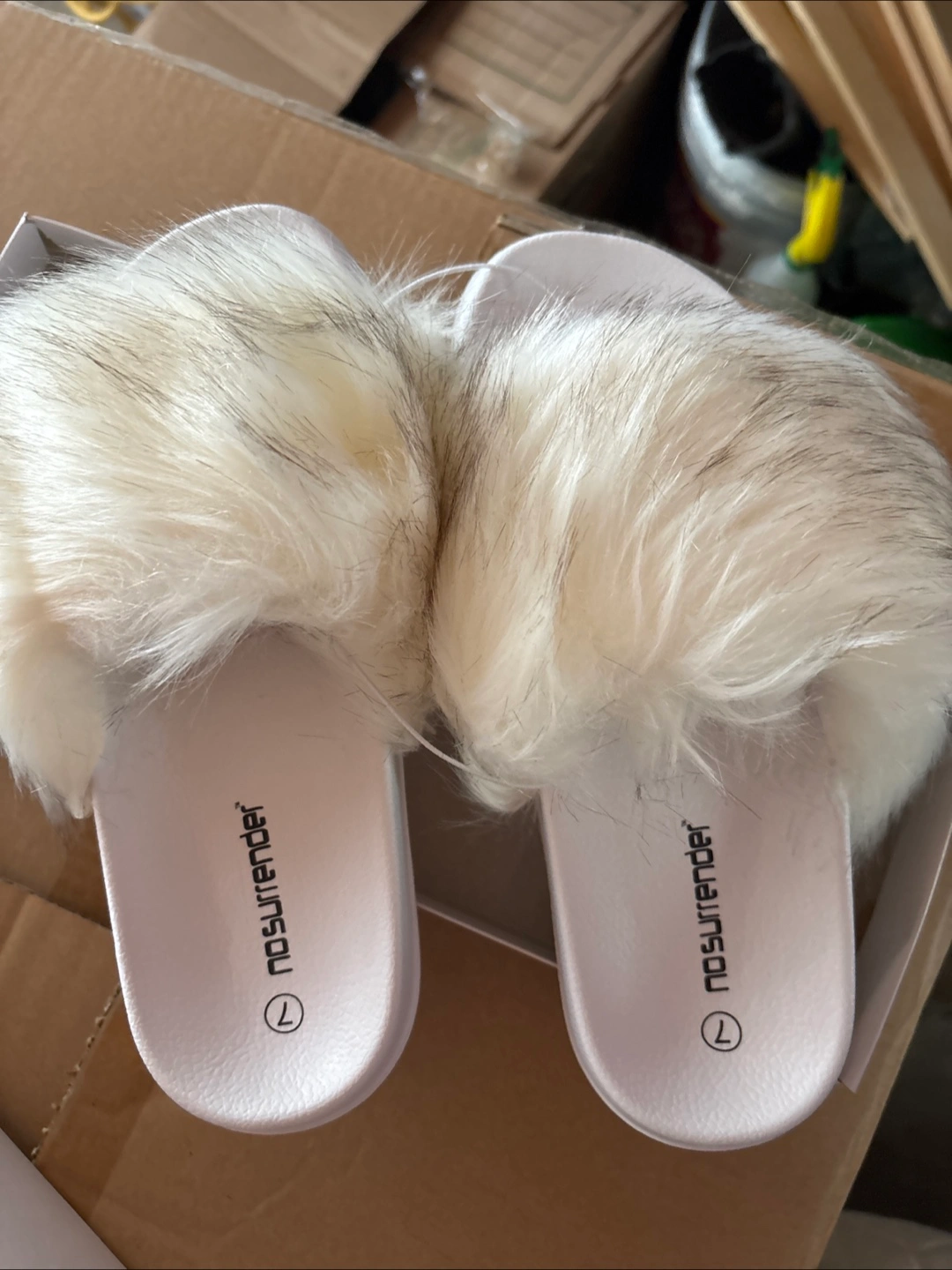 Selling a pair of No Surrender furry slides in white. They are a size 7 and in great condition. Super comfy and stylish for around the house!