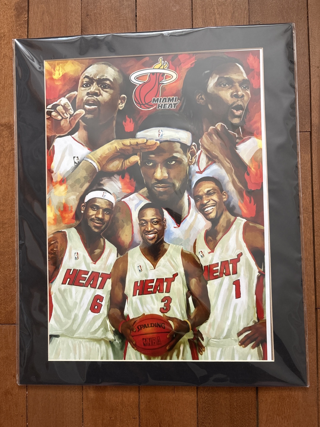 Art print featuring the Miami Heat basketball team. The print showcases iconic players in action. Perfect for any basketball fan's collection or as a decorative piece for a sports-themed room.