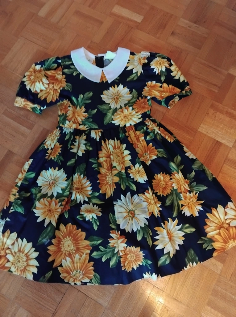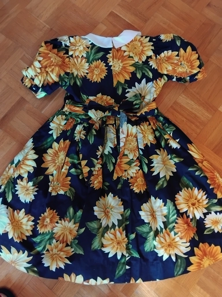 This is a cute floral print dress with a white collar. It features a dark background with a vibrant sunflower pattern. The dress has short, puffed sleeves and a tie at the waist. It's in great condition and ready for a new home. Size 7