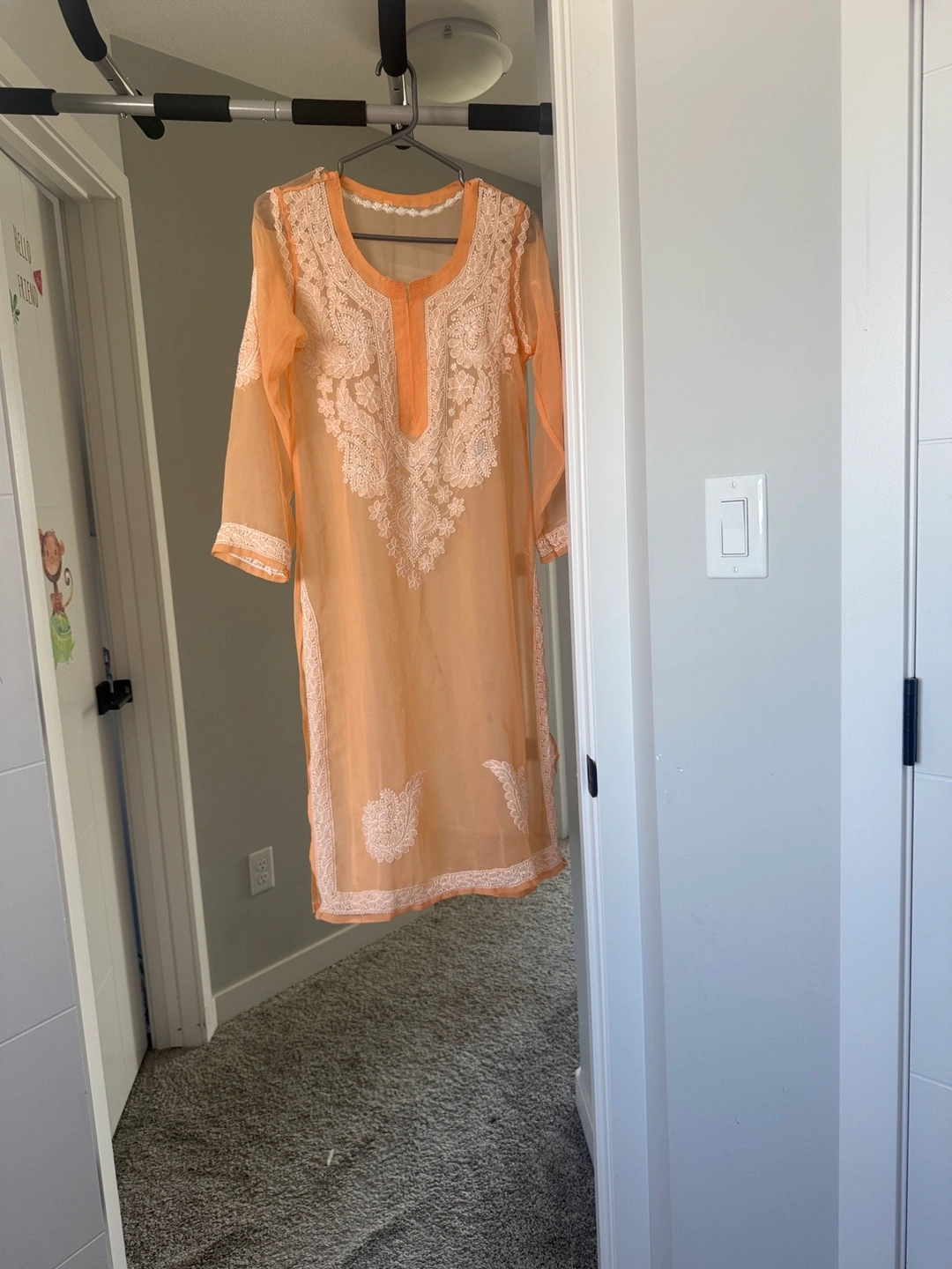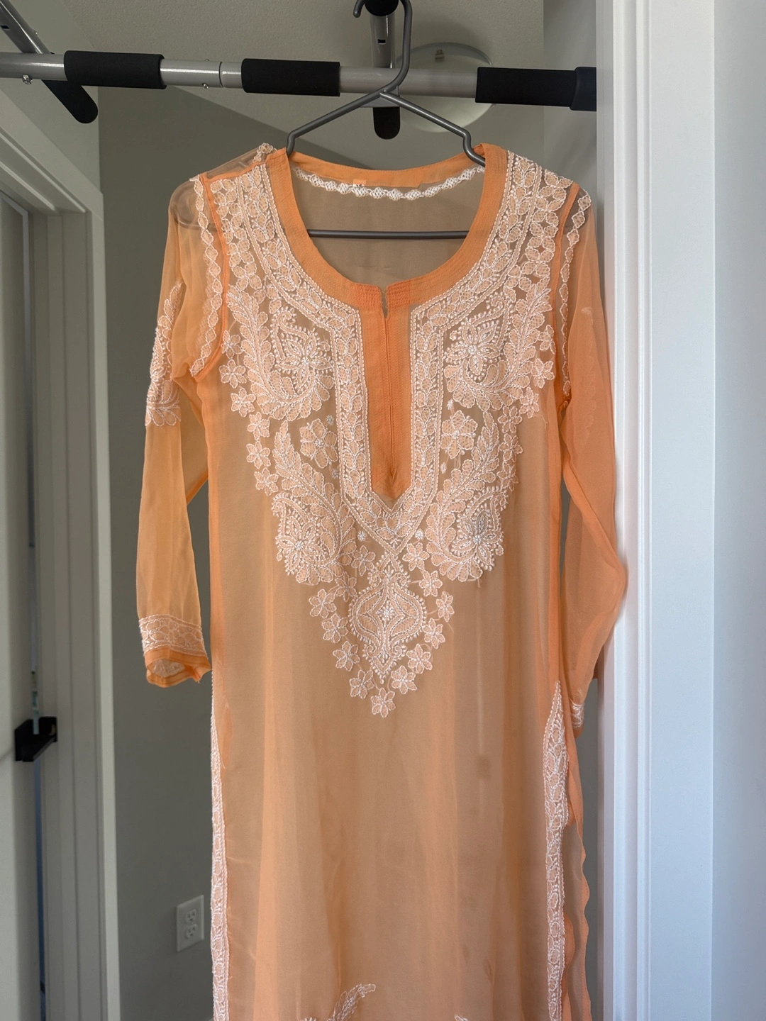 Beautiful peach-coloured chikankari kurti. It's a lightweight and breathable piece, perfect for warmer weather! The intricate embroidery adds a touch of elegance. Inner is included