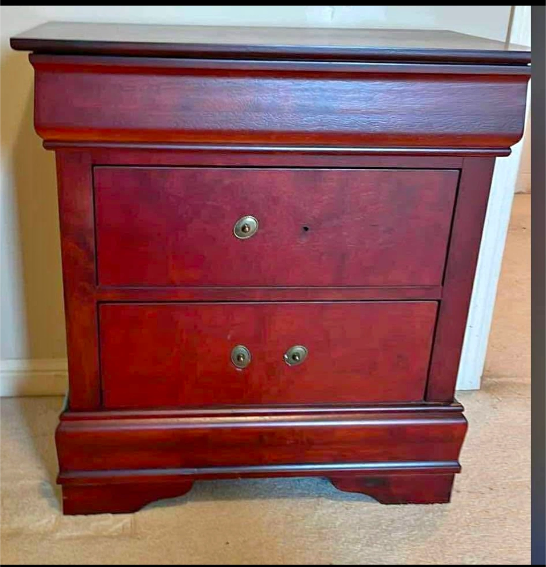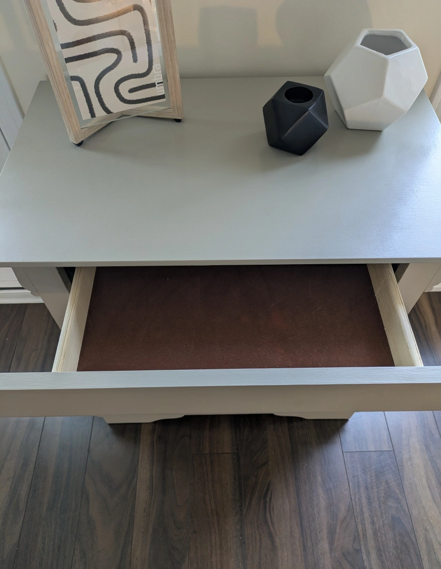 15" Refinished" Selling a Taupe painted nightstand with 3 drawers. 1st drawer is covered with velvet. It's in great condition and would be a lovely addition to any bedroom!