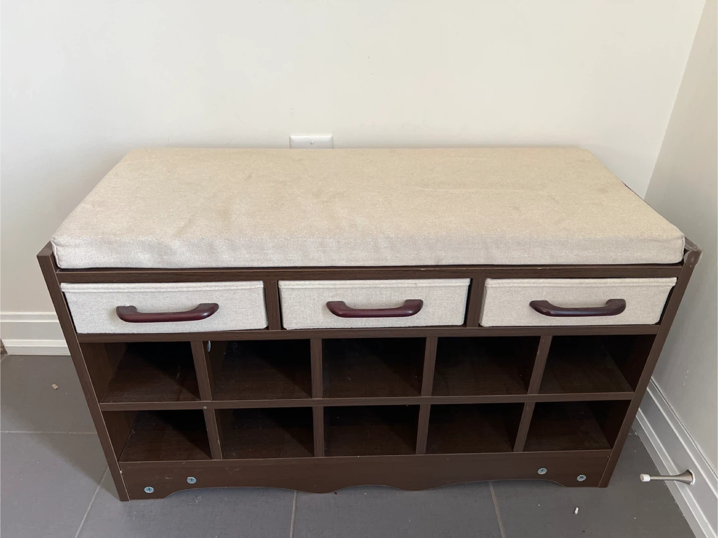 Looking to declutter your entryway? This shoe storage bench is perfect! It features a comfy cushioned top and plenty of space to organize your shoes. The bench is in great condition and ready for a new home