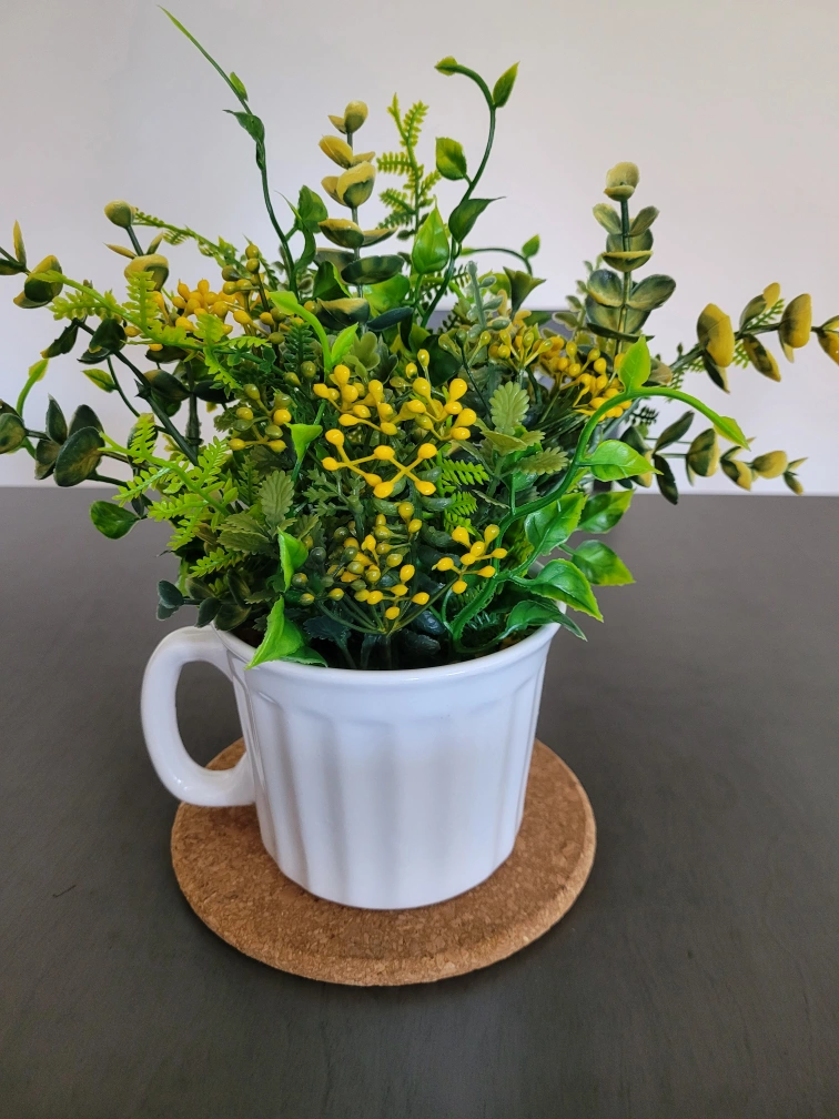 Get 2 for the low price of $25. A charming artificial floral arrangement in a cute mug! It's perfect for adding a touch of greenery to any space without the upkeep of real plants. The arrangement features a mix of green and yellow flowers and foliage, set in a white mug. There are 2 separate arrangements!