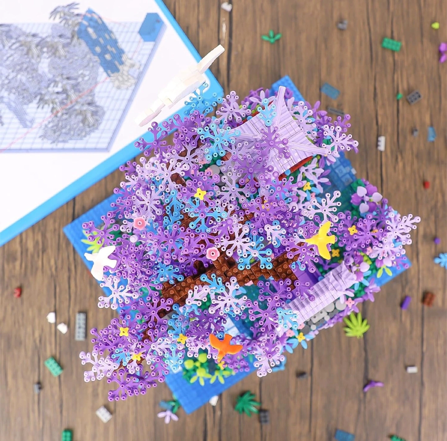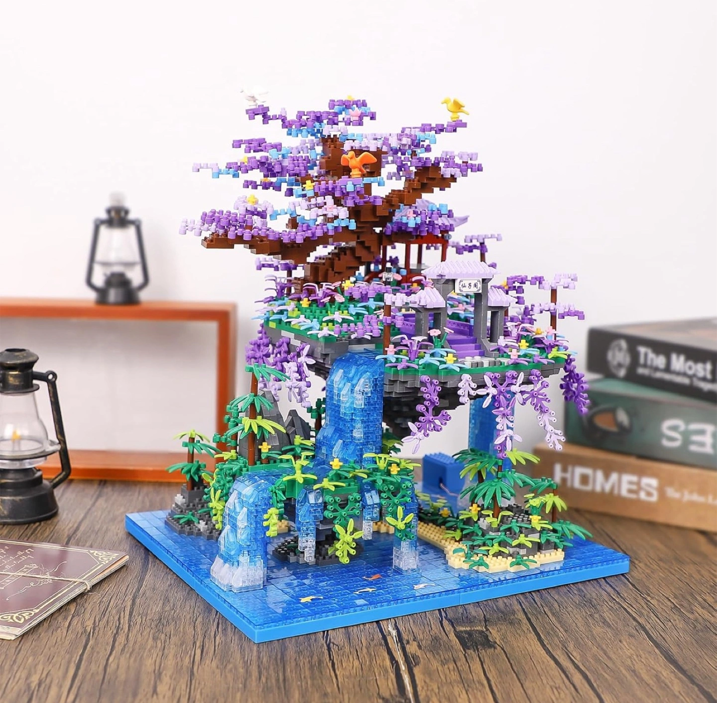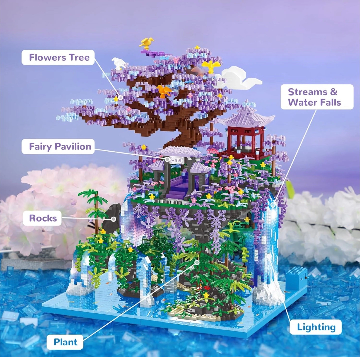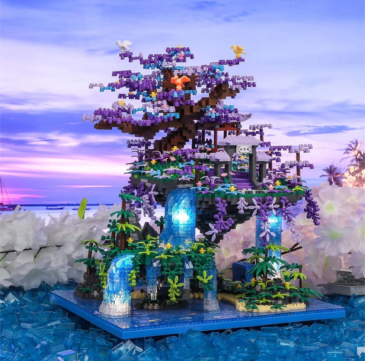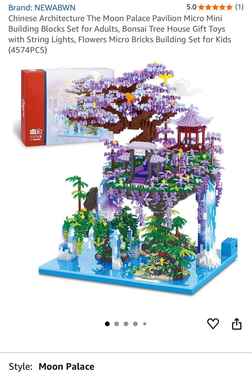 Brand New Sealed NEWABWN Chinese Architecture The Moon Palace Pavilion Micro Mini Building Blocks Set for Adults! It is a Bonsai Tree House Gift Toys with String Lights, Flowers Micro Bricks Building Set for Kids (4574PCS). The dimensions are 12.7in x 3.1in x 17.3in