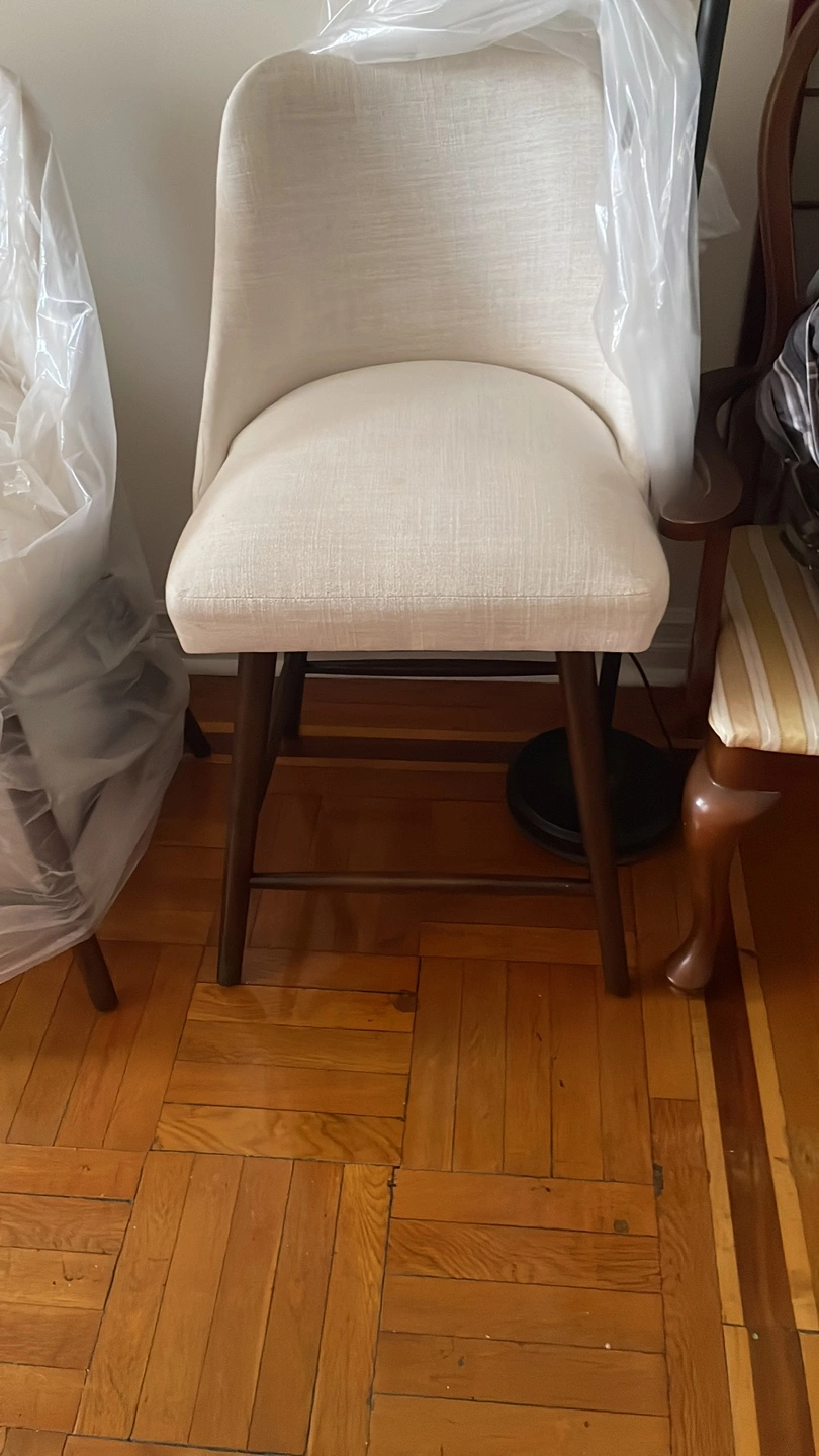 60Selling a bar stool with light-colored upholstery and dark wood legs. It's in great condition and still partially wrapped in plastic. Perfect for adding a touch of modern style to your kitchen or bar area!