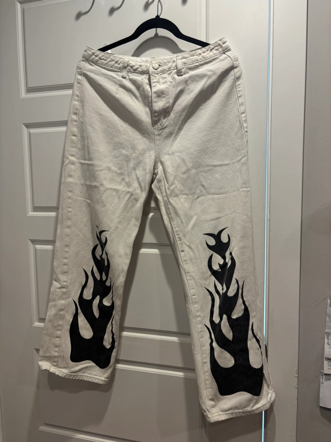 Selling a pair of white jeans with a cool flame design on the legs. They're in great condition and ready for a new home!