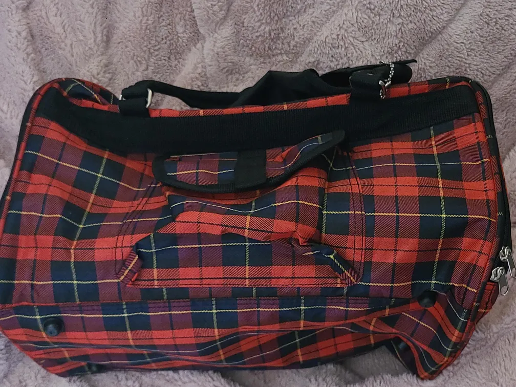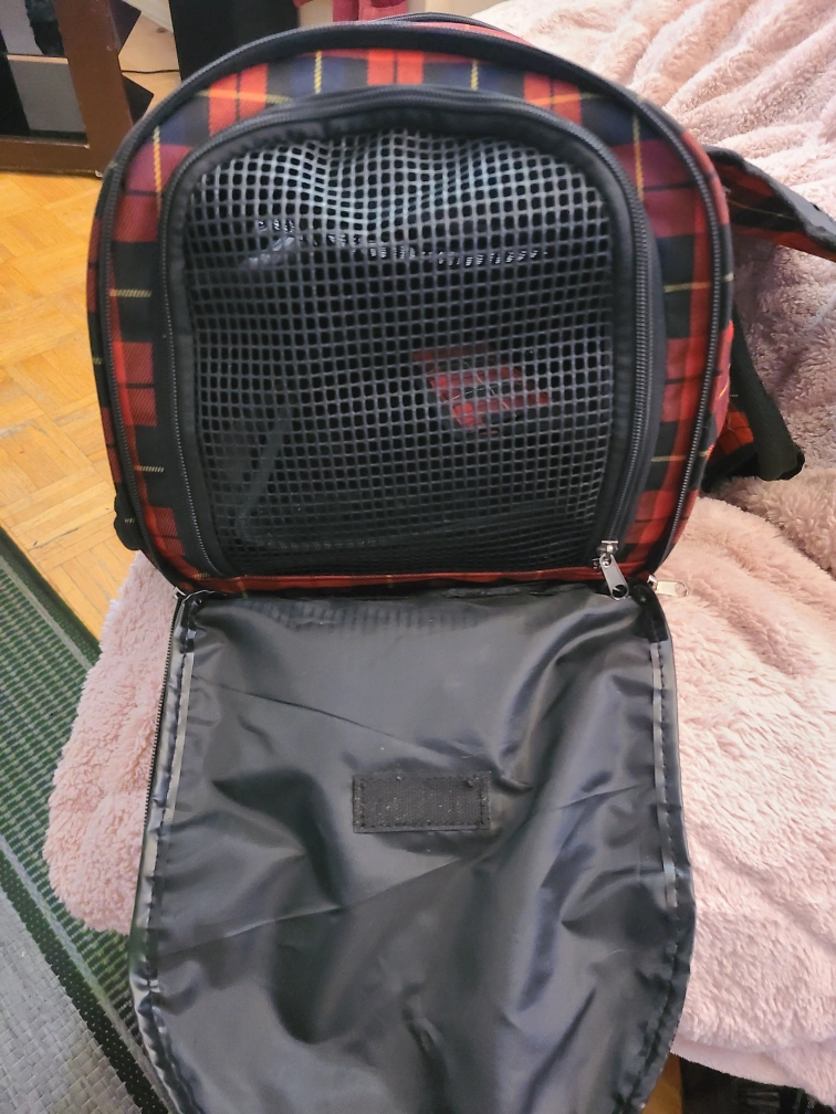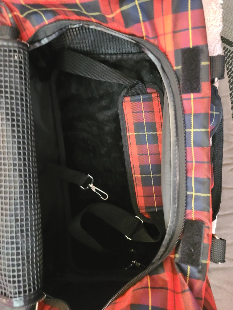 Selling a pet carrier with a red plaid pattern! It features a mesh window for ventilation and visibility, plus a convenient front opening. The inside has a soft lining and a strap for securing your furry friend. Perfect for vet visits or travel Value 75$