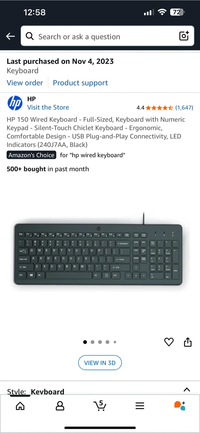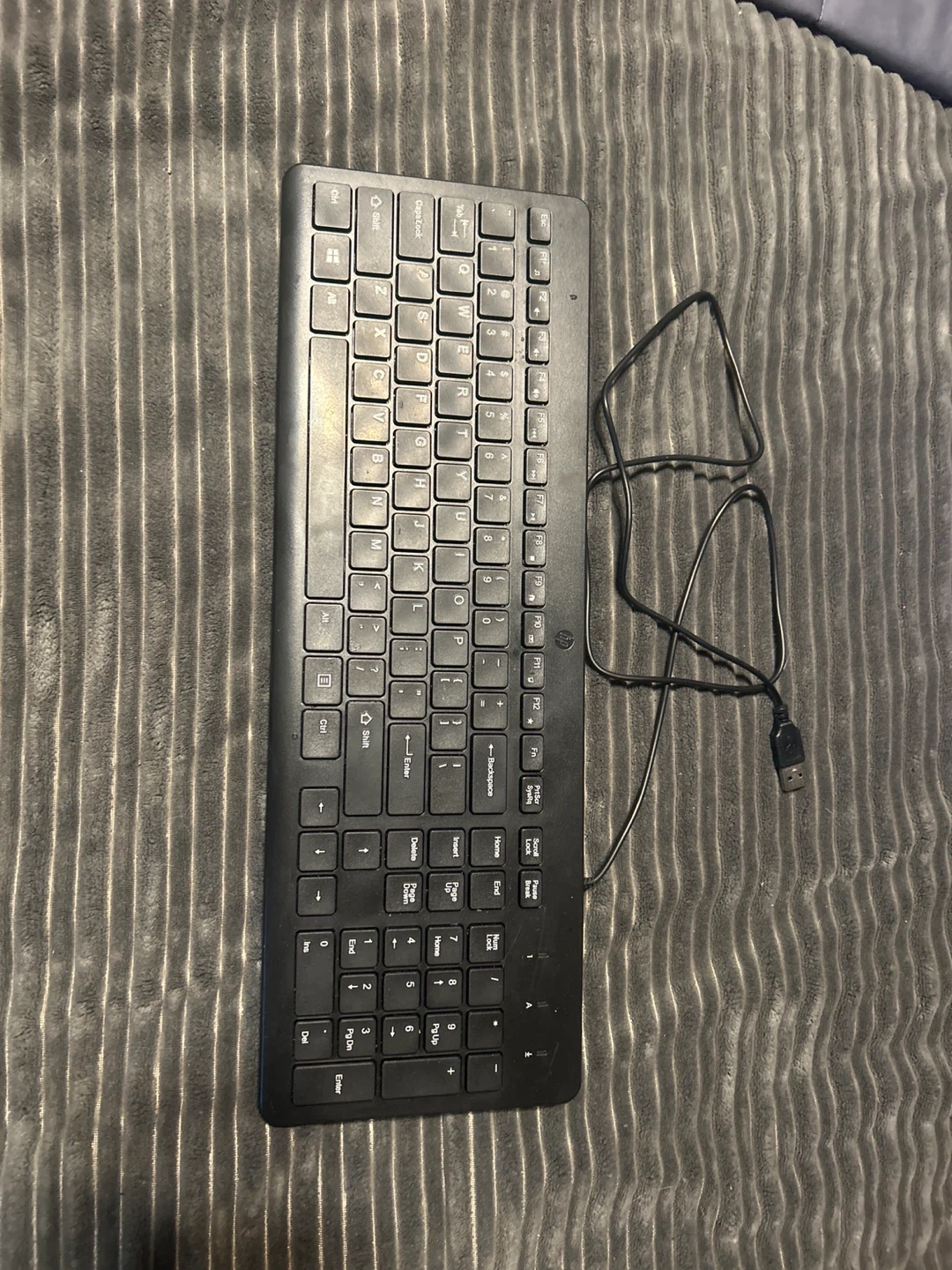 Selling a used HP 150 wired keyboard in black. It's a full-sized keyboard with a numeric keypad, perfect for everyday use. It features silent-touch chiclet keys for comfortable typing and USB plug-and-play connectivity. Great for anyone needing a reliable keyboard!