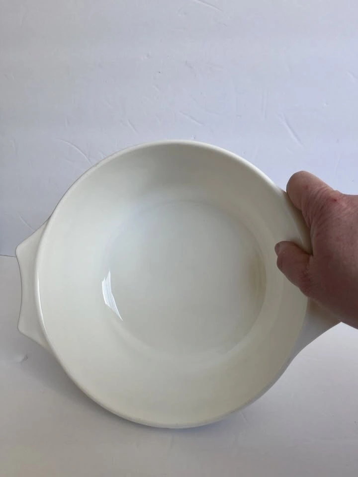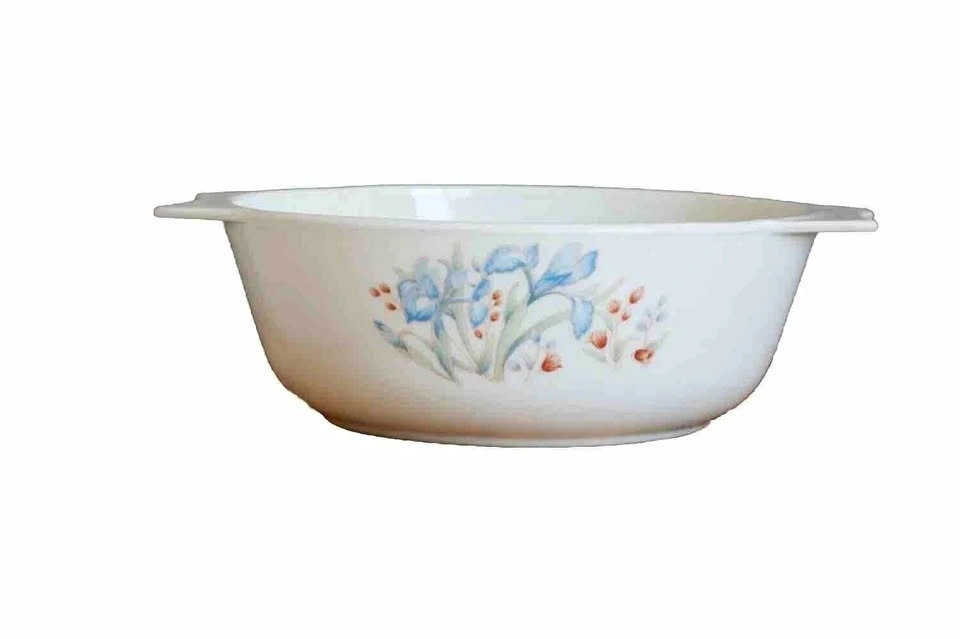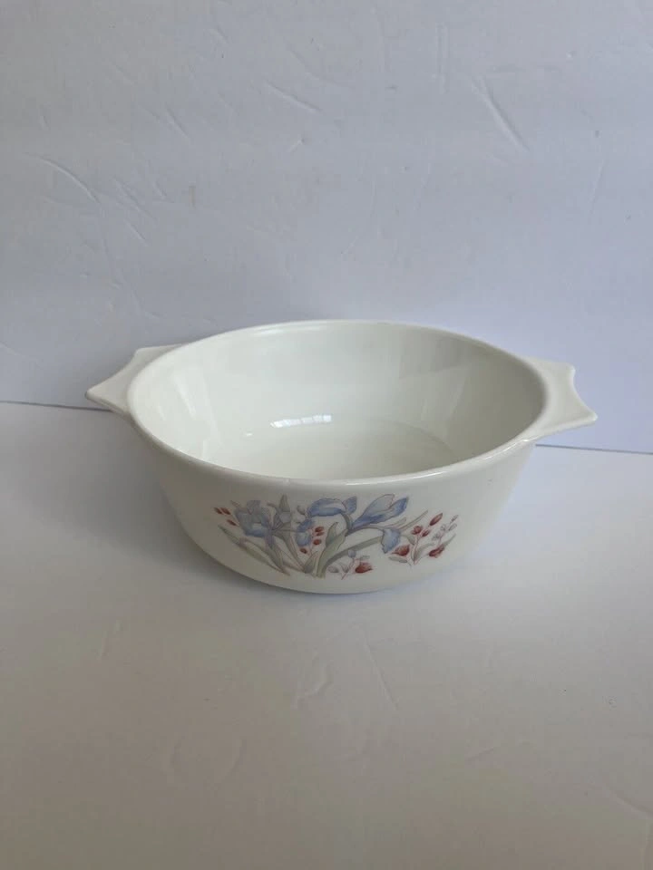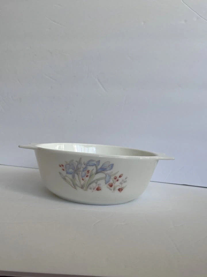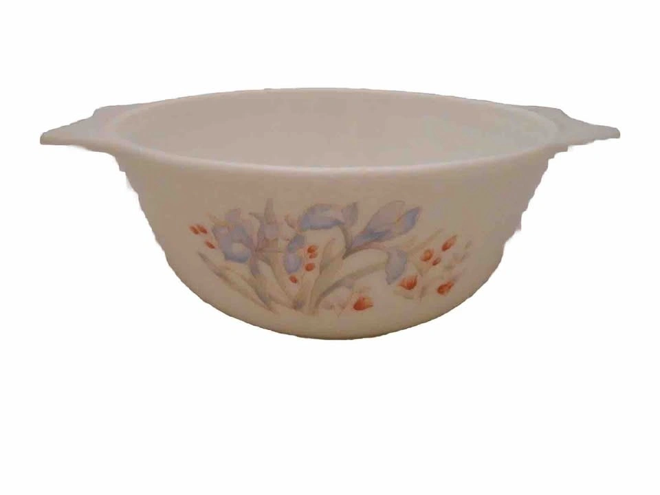 21This beautiful serving bowl from PYREX JAJ England features a lovely blue iris pattern on a white milk glass material. This bowl/casserole dish is perfect for serving casseroles and other dishes. The durable glass construction ensures they will last for many years to come. ideal for small gatherings or everyday use. Add this stunning piece to your collection today! Please make sure to open and view all photos as this counts towards item description and condition