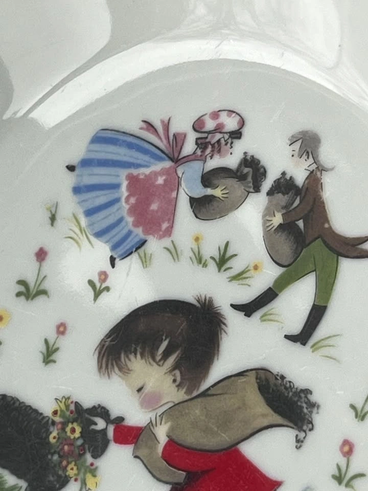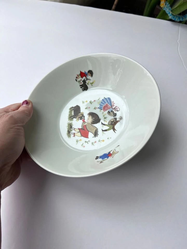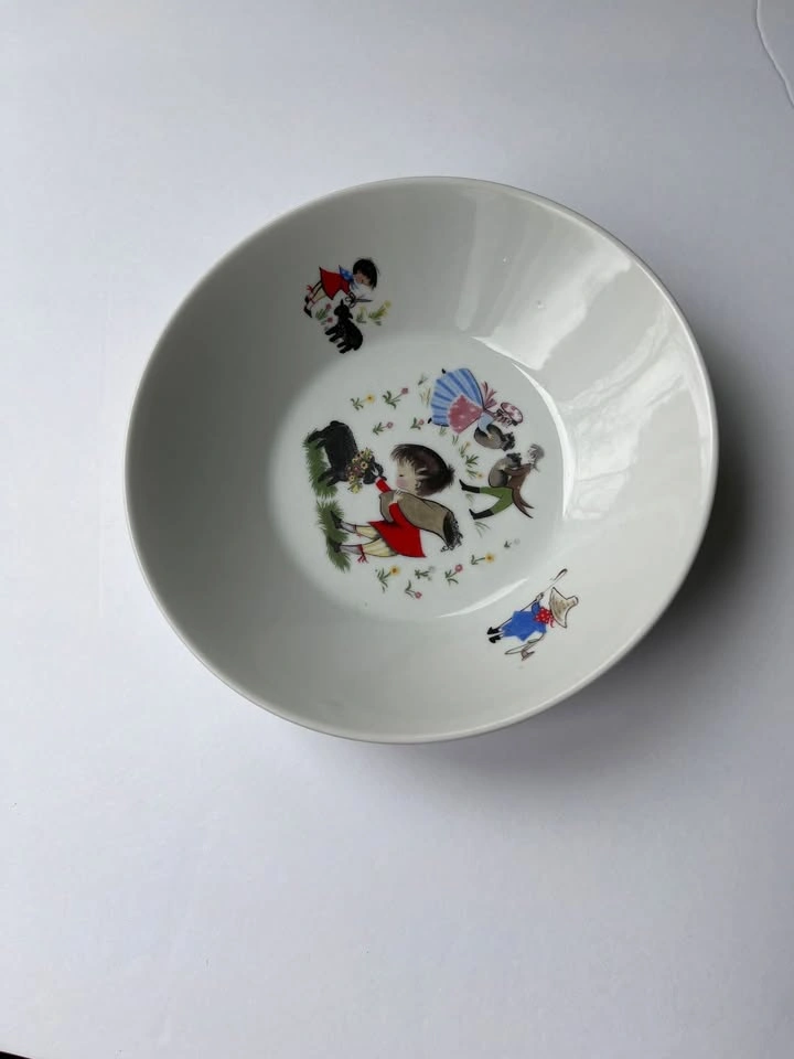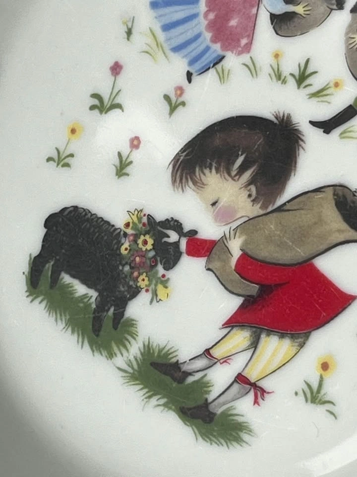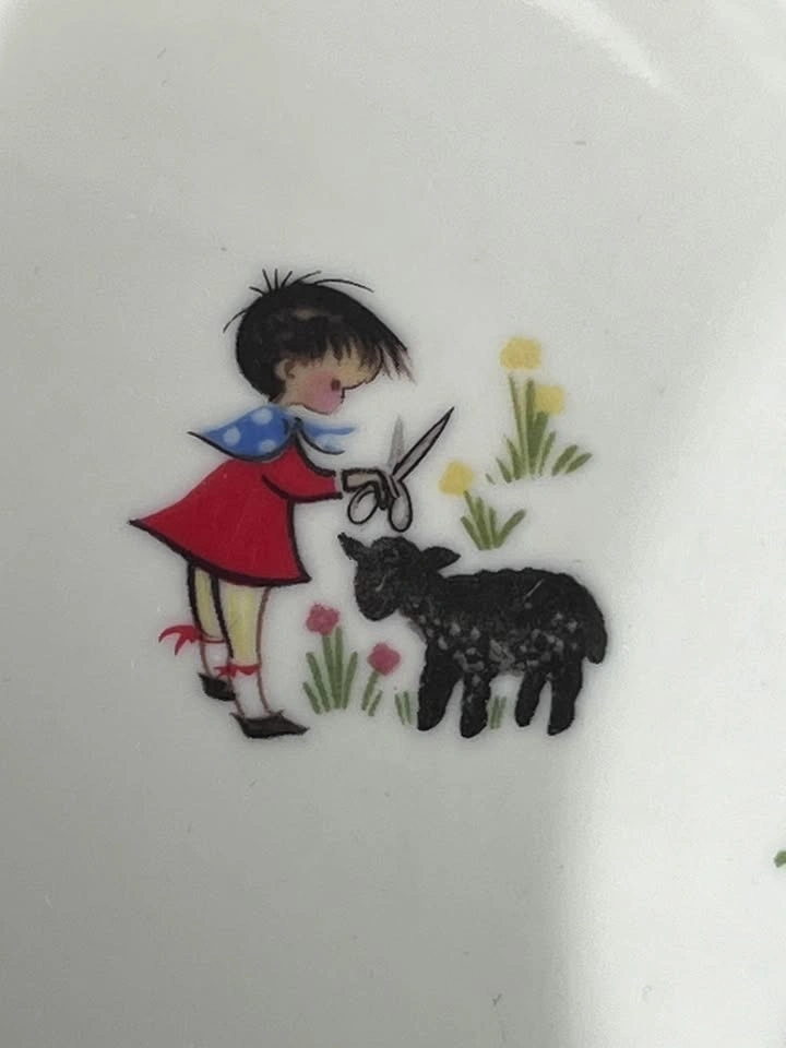21This bowl is absolutely adorable. It is from a line called fantasy. Made by pars China. It is just about 7 1/4 inches across and the depth from the bottom of the bowl to the top of the rim is 2 1/4 inches. This piece does have a couple of dimple marks, however, they are from manufacturing and very normal. Set of bowls was designed around famous nursery rhymes, and this one is baa baa black sheep. As with all vintage serveware and cookware it is up to you to find out if it is suitable for you or your family please ask any questions or address any concerns prior to purchase. Please make sure to open up all the pictures as they count towards the item condition.