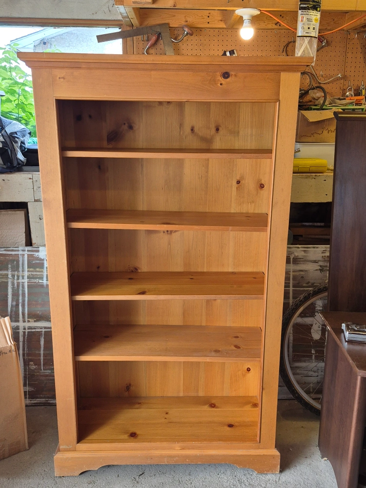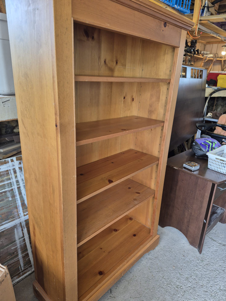 Here's a lovely wooden bookcase with adjustable shelves! It's perfect for displaying your favourite books or adding some storage to your home. The wood has a warm, natural tone that would fit in with many decor styles. It's in good condition and ready for a new home
