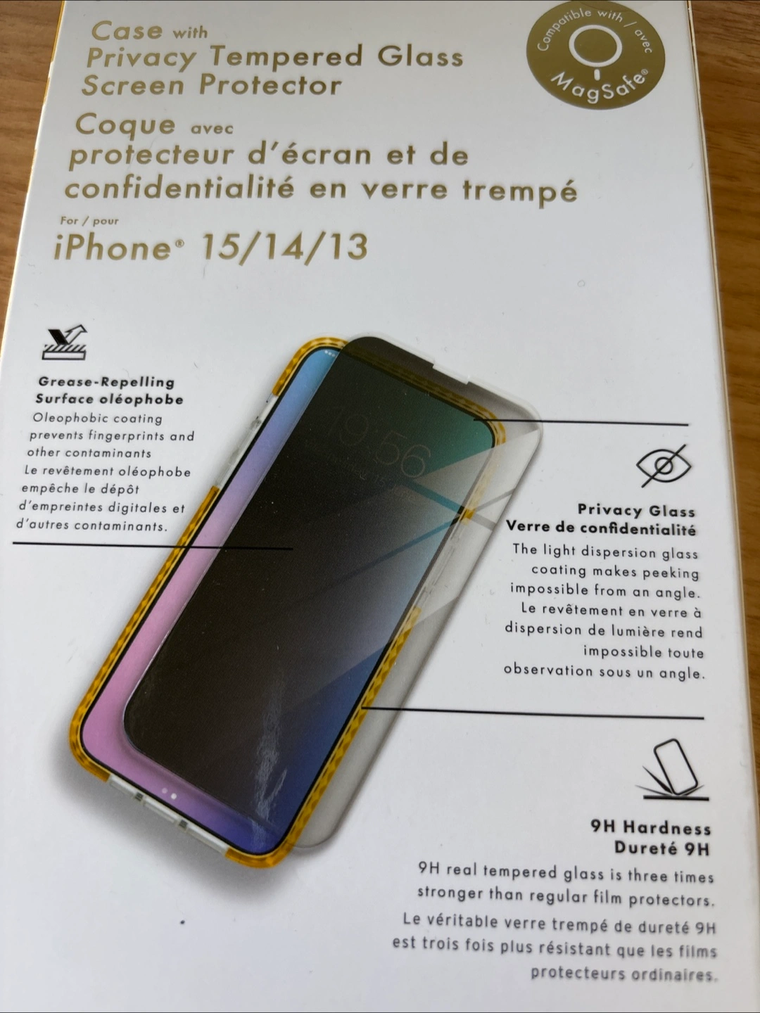 I'm selling a case with a privacy tempered glass screen protector for iPhone 15/14/13. It features: