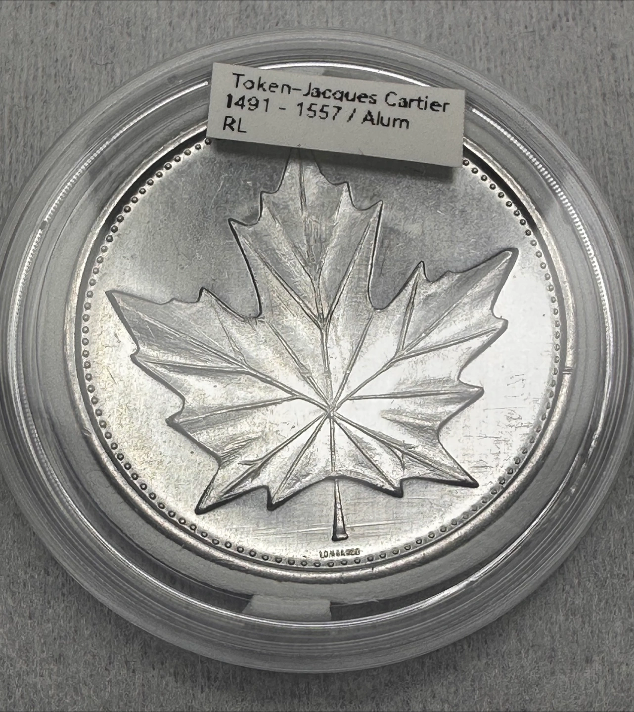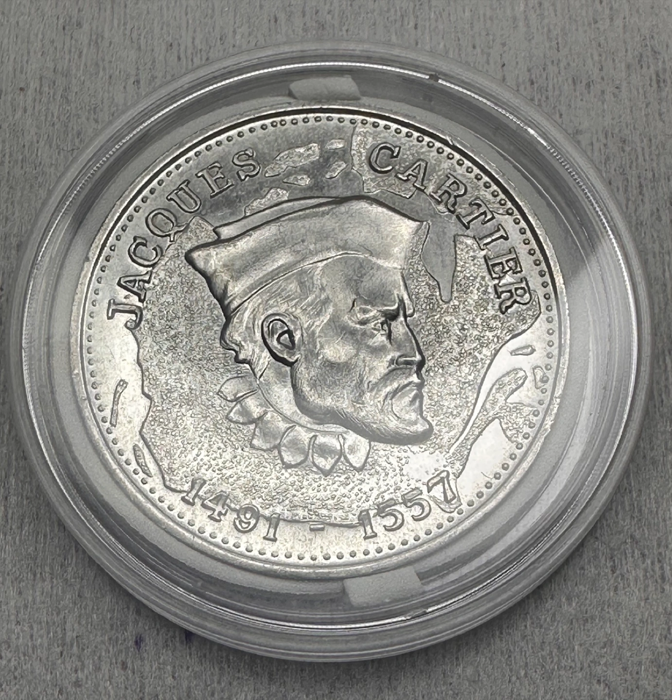 Selling a collectible rare find Aluminum Jacques Cartier token commemorating 1491-1557. The token features a portrait of Jacques Cartier on one side and a maple leaf on the other. It's in great condition and comes in a protective case.