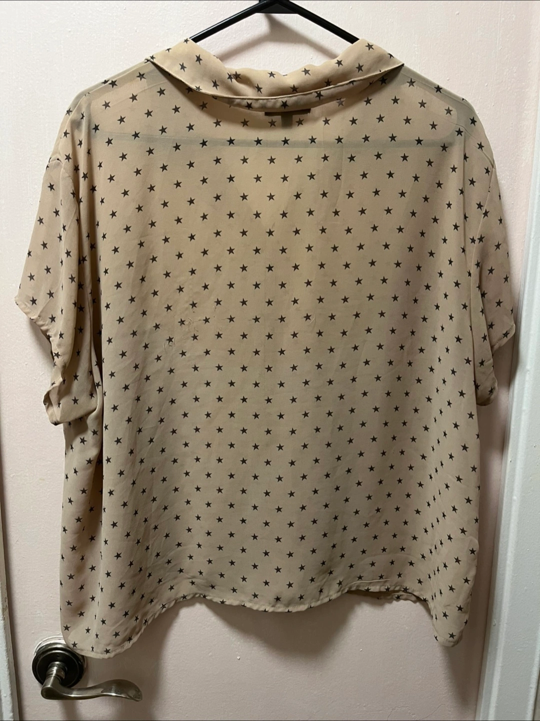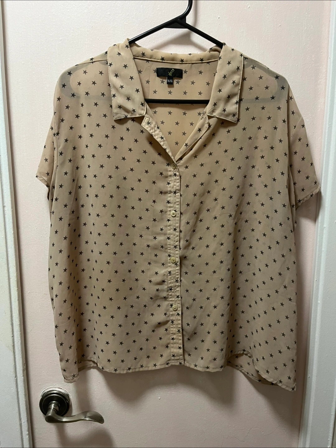 Selling a light, thin, cute blouse in size XL! It features a beige colour with a star print. Can be worn over a camisole, dress