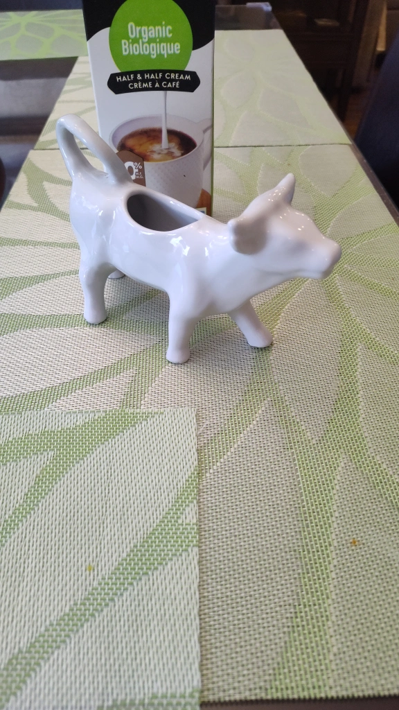 This is a cute ceramic cow creamer! It's in great shape and ready to add some charm to your kitchen or table setting. It's white and perfect for serving cream or other liquids with a touch of whimsy