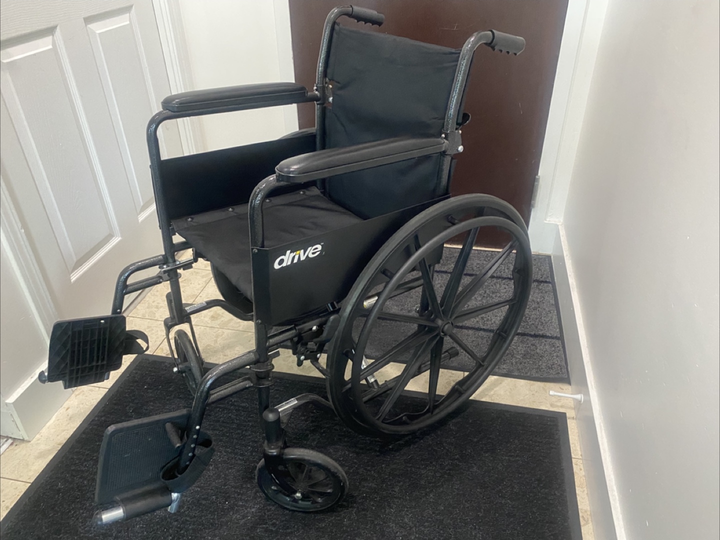 Selling a Drive Medical wheelchair. It's in very good condition and ready to use. Perfect for someone needing mobility assistance. The wheelchair is black and has a sturdy frame. Please take a look at the photos for details!