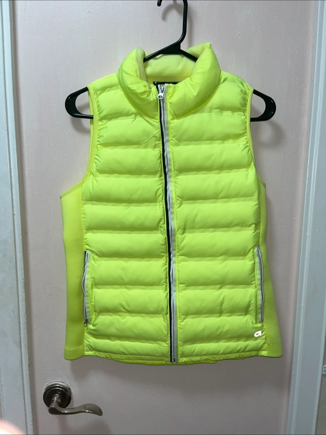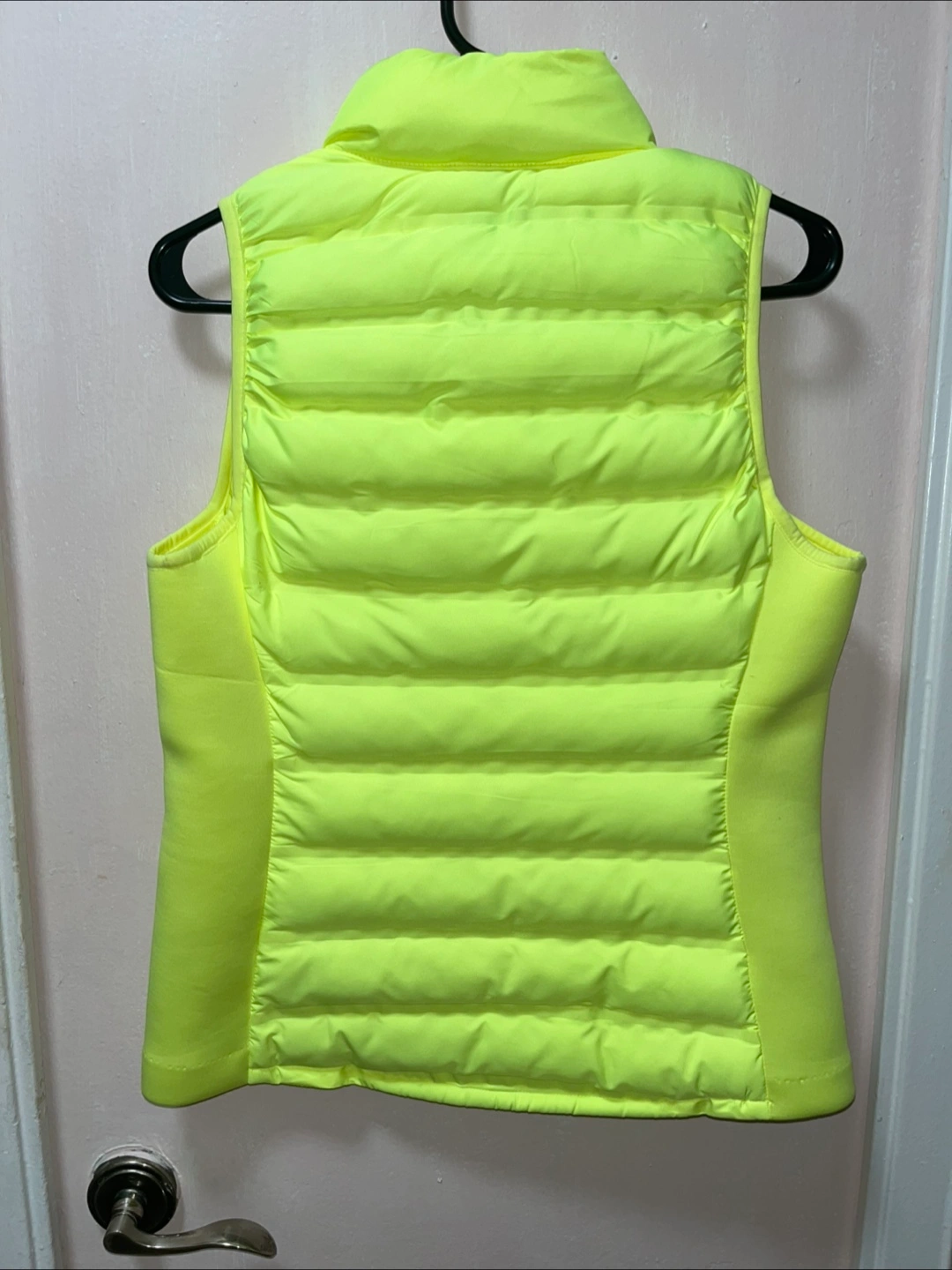 Selling a GapFit puffer vest in a vibrant neon yellow! It's in great condition and ready to keep you warm. Perfect for layering or wearing on its own during those milder days. The vest has a full zipper and side pockets. Size is not indicated.