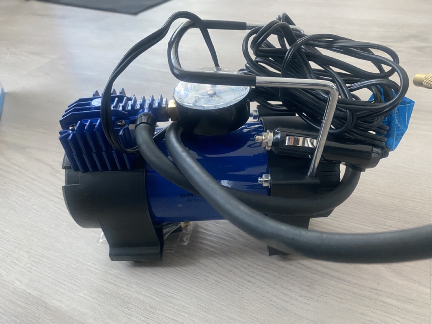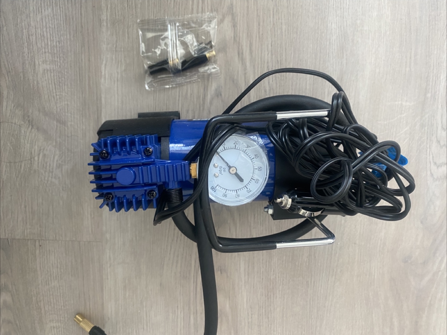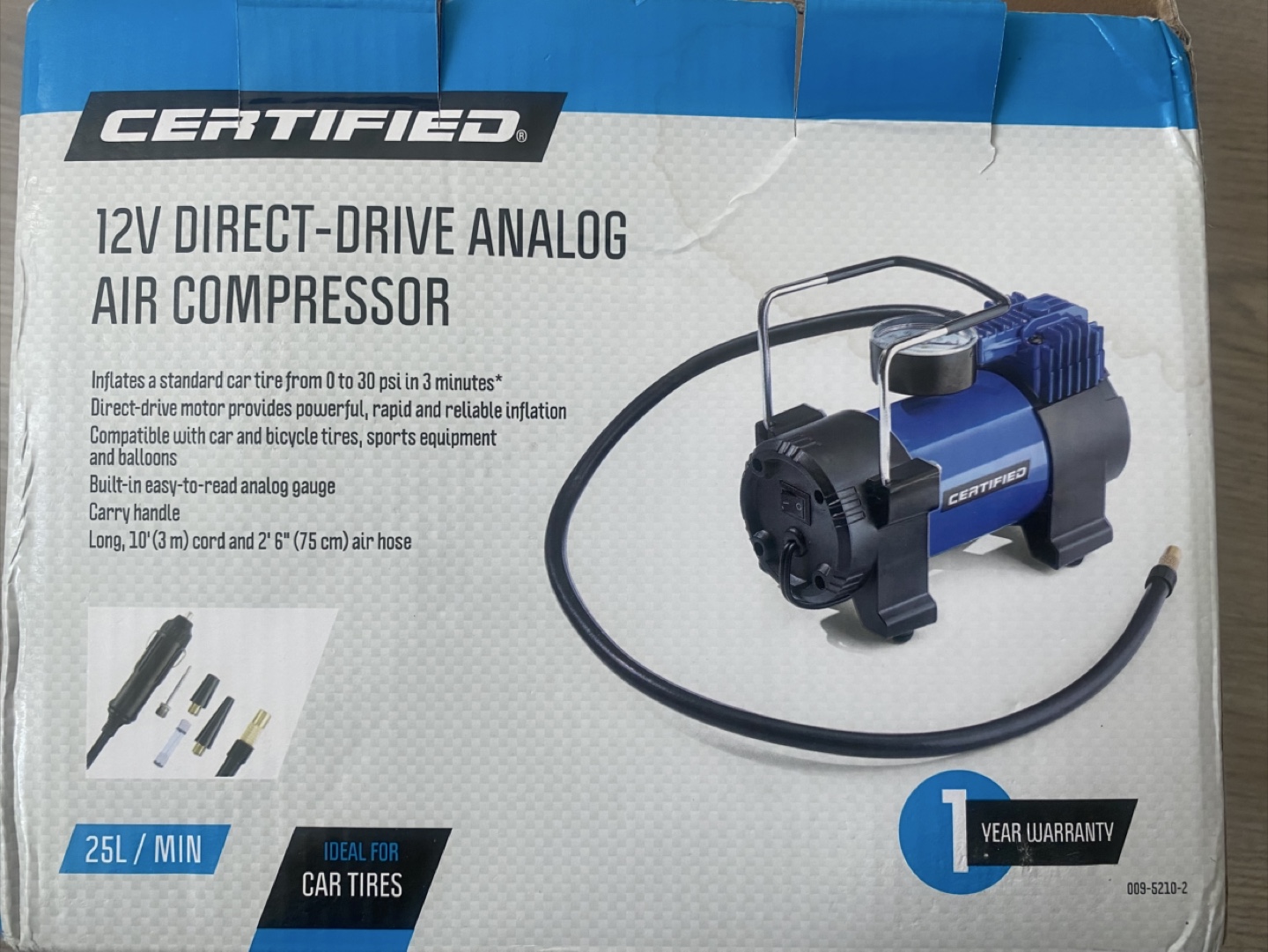 Selling a brand new Certified 12V Direct-Drive Analog Air Compressor! It comes in the original box and includes all components. This compressor can inflate a standard car tire from 0 to 30 psi in 3 minutes. It's compatible with car and bicycle tires, sports equipment, and balloons. Features a direct-drive motor for powerful and reliable inflation, a built-in easy-to-read analog gauge, a carry handle, and a long 10' (3 m) cord and 2' 6" (75 cm) air hose