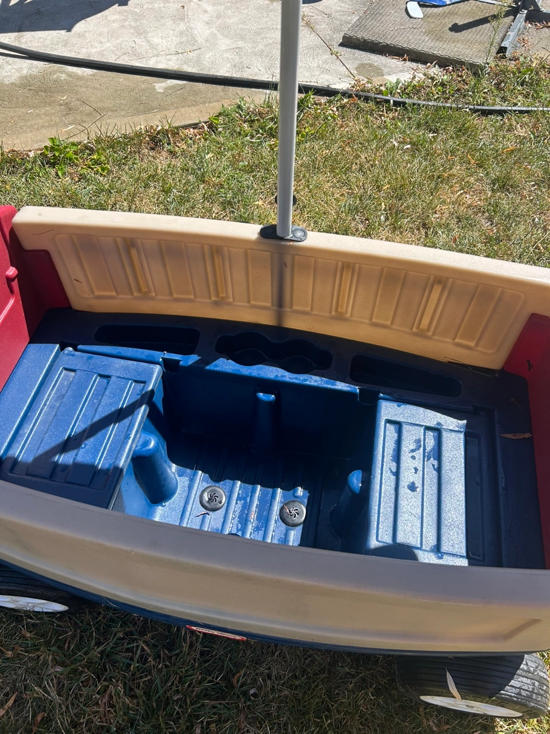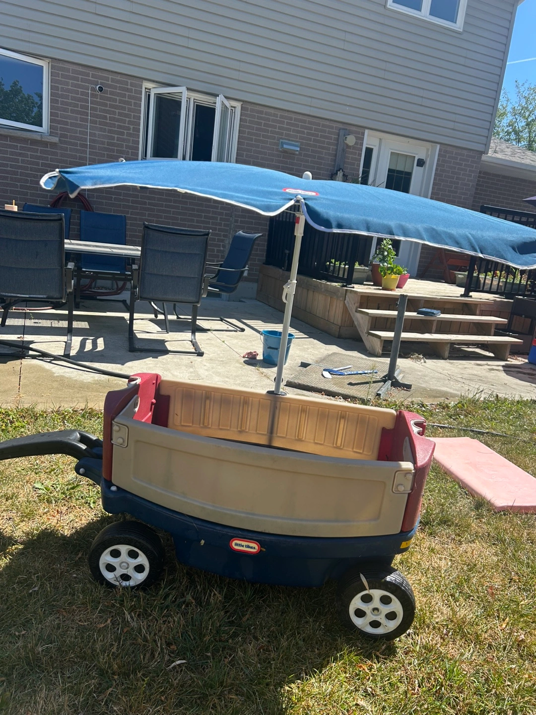Selling a Little Tikes wagon, perfect for little ones! It comes with a handy umbrella to keep the sun off your kids while you're out and about. It's in good condition and ready for new adventures! Converts from a wagon to a bench! Attachable cooler bag included.