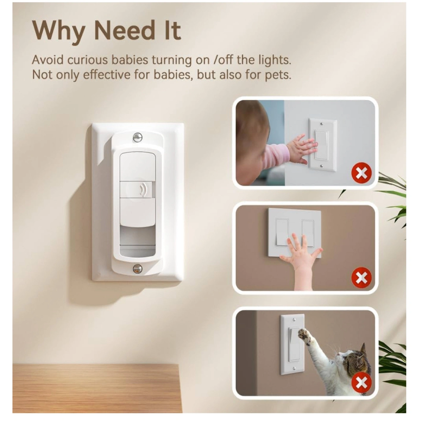 Keep your little ones safe with this 3 pack of light switch guard covers! These child-proof covers prevent kids from turning lights on and off. Easy for adults to use with one hand, but hard for babies. Installs easily with screws.