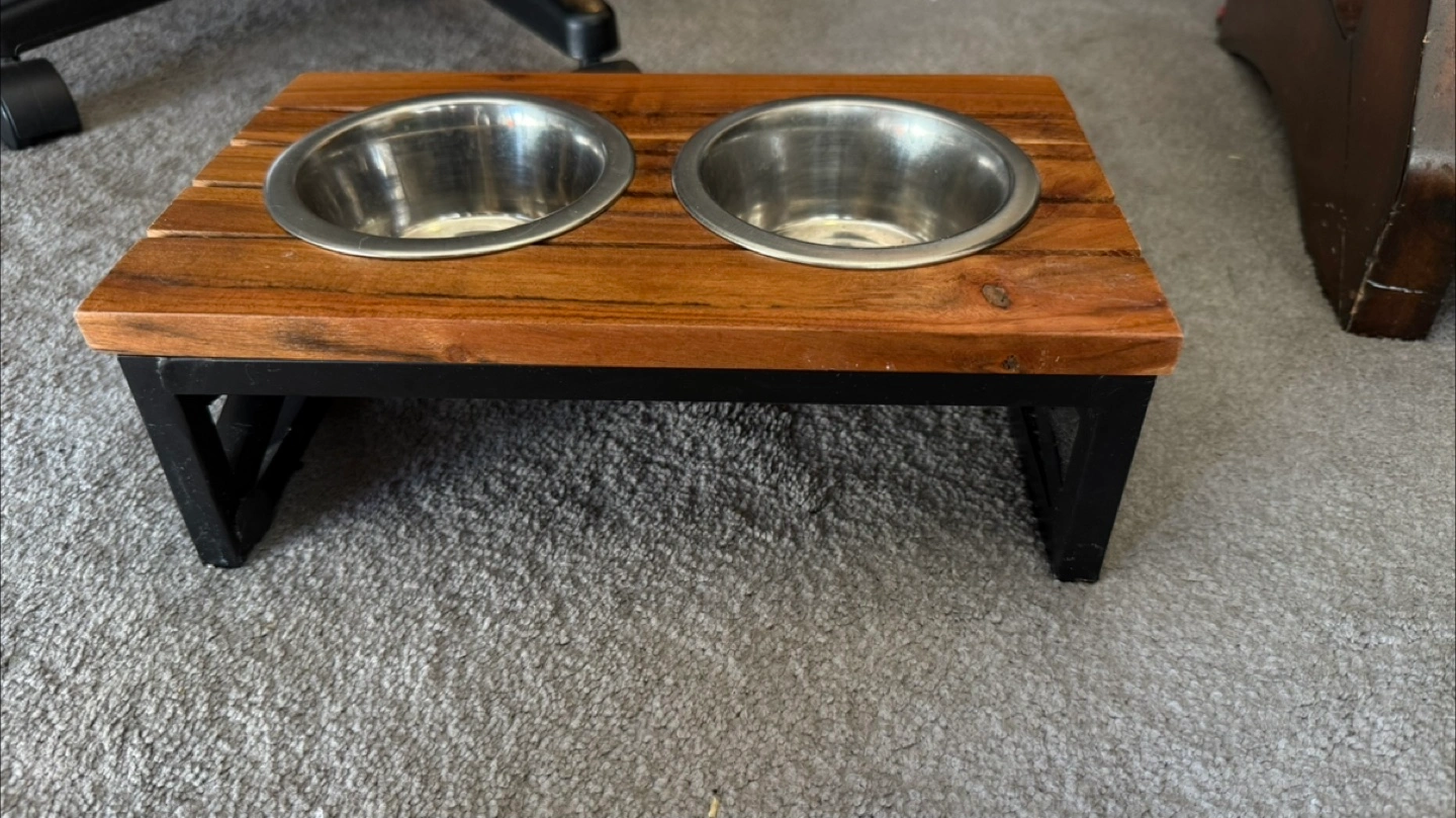 Selling a cute elevated double dog bowl stand! It's in great condition and perfect for your furry friends. The stand is made of wood and metal, and it has two stainless steel bowls with paw print designs. It's a great way to keep your dog's food and water off the floor and prevent spills