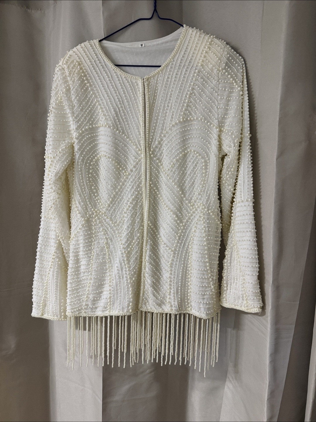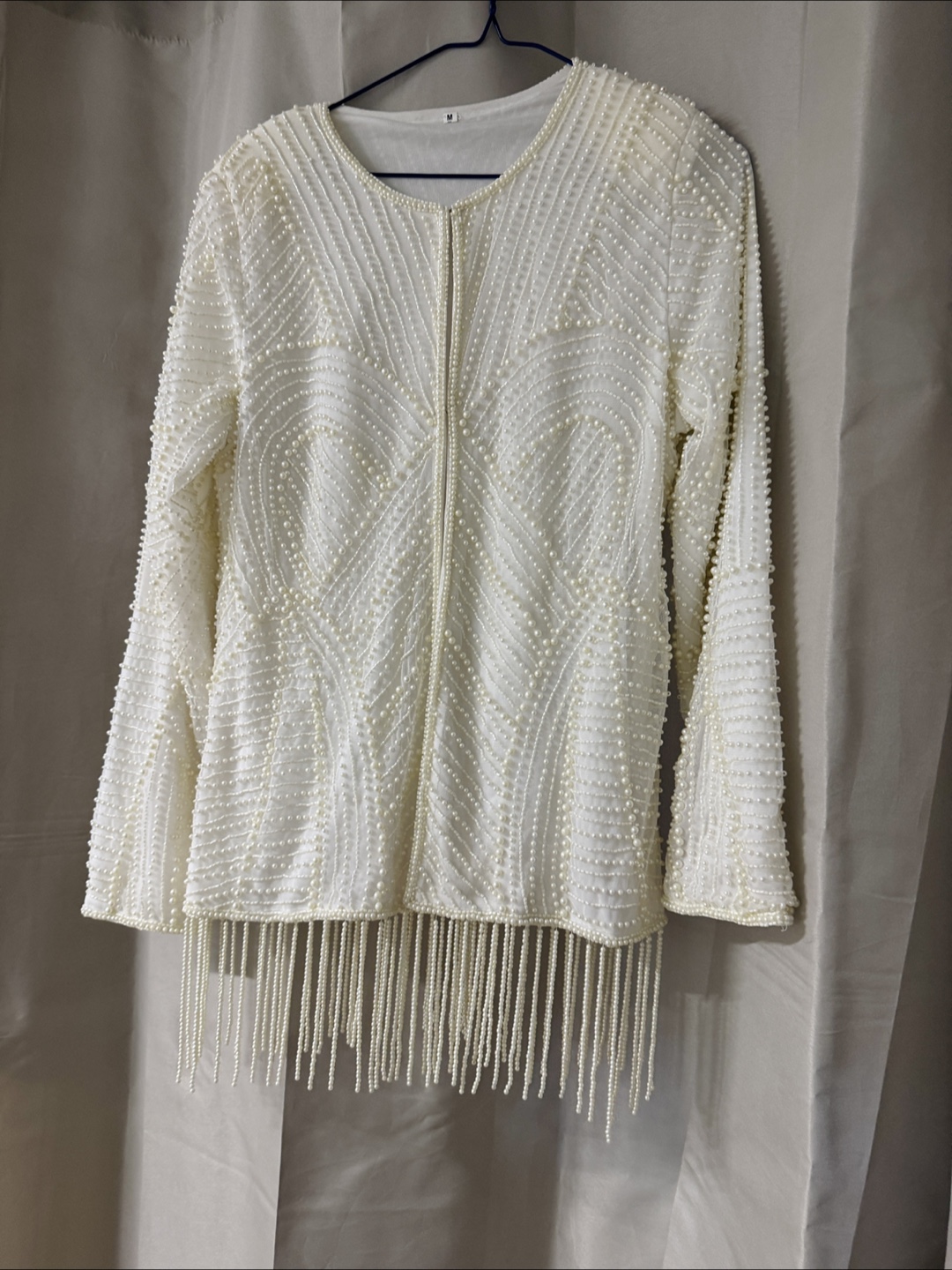 Selling a beautiful beaded white jacket in size medium! It's in great condition and adds a touch of elegance to any outfit. The intricate beadwork and fringe detail make it a unique and eye-catching piece