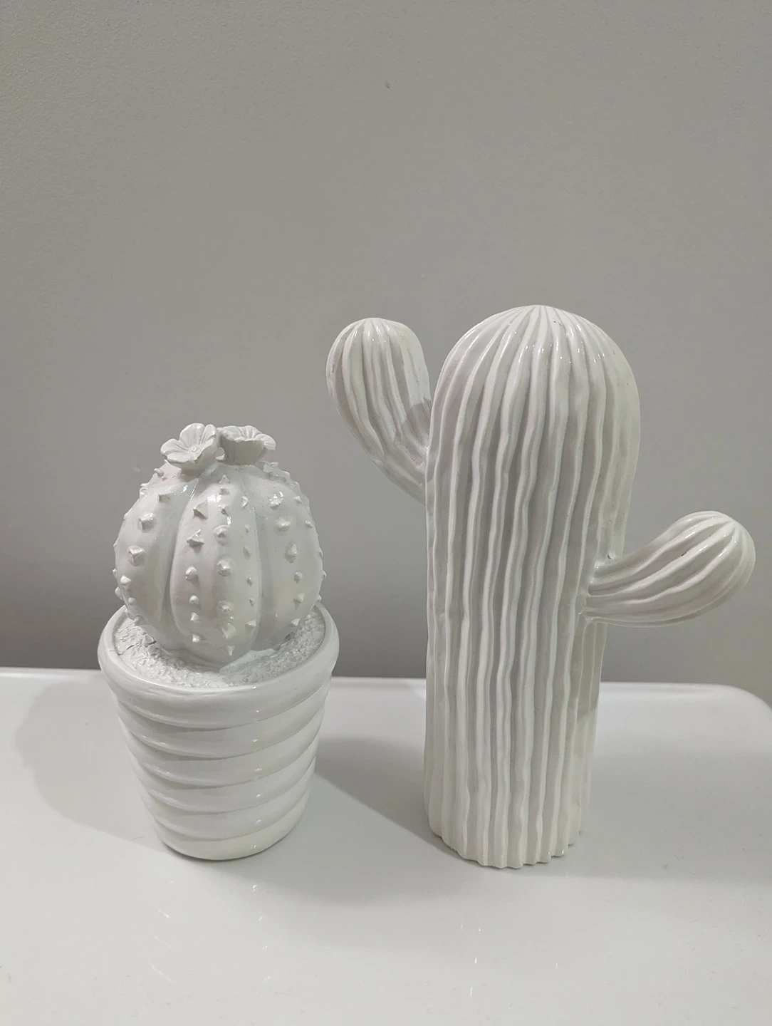 Cute cactus figurines made out of plastic. They'll never die! Smaller one is 7 inches tall, larger one is 8 inches tall.