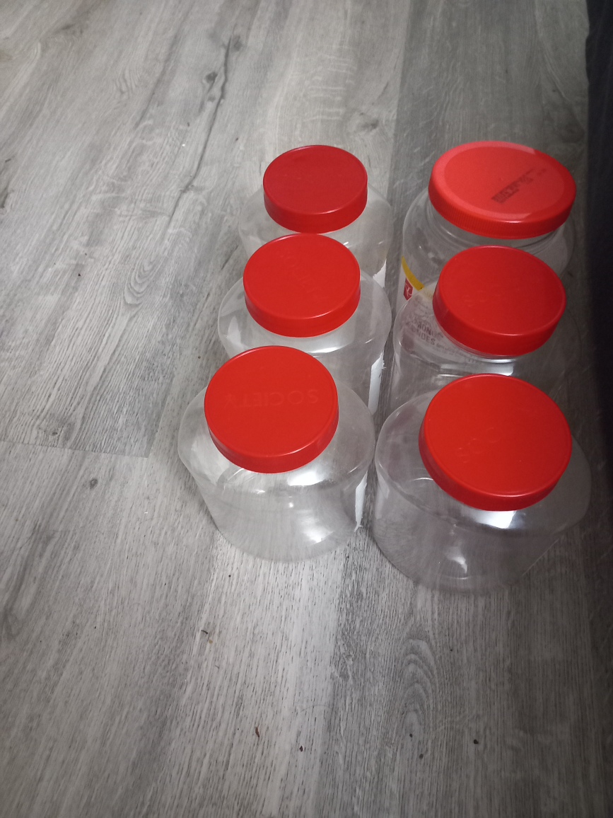 a set of six Ranios plastic storage jars. They're perfect for organizing your pantry or storing craft supplies. Each jar has a red lid and is made of clear plastic so you can easily see what's inside!