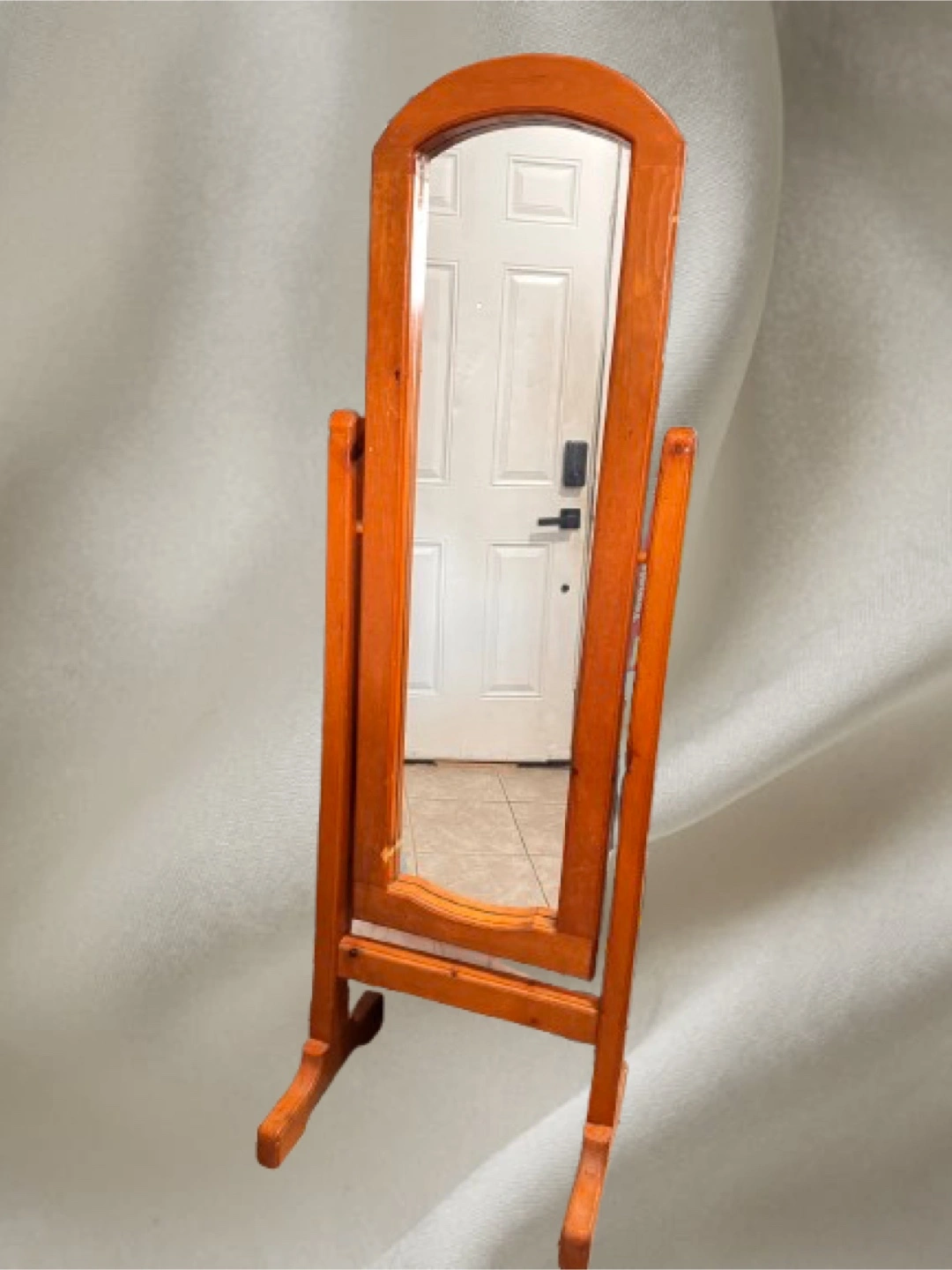 Selling a standing mirror with a wood frame. It's in good condition and would be a great addition to any room!