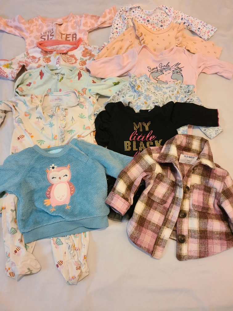 A cute collection of baby clothes in various styles and brands! Includes onesies, a cozy owl sweater set, and a stylish Old Navy plaid jacket. Perfect for your little one!